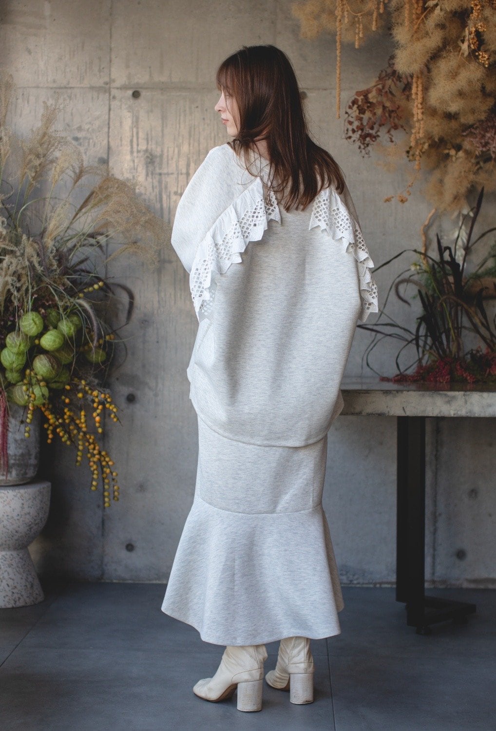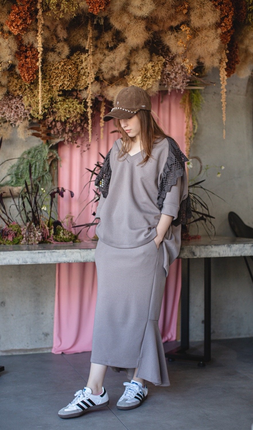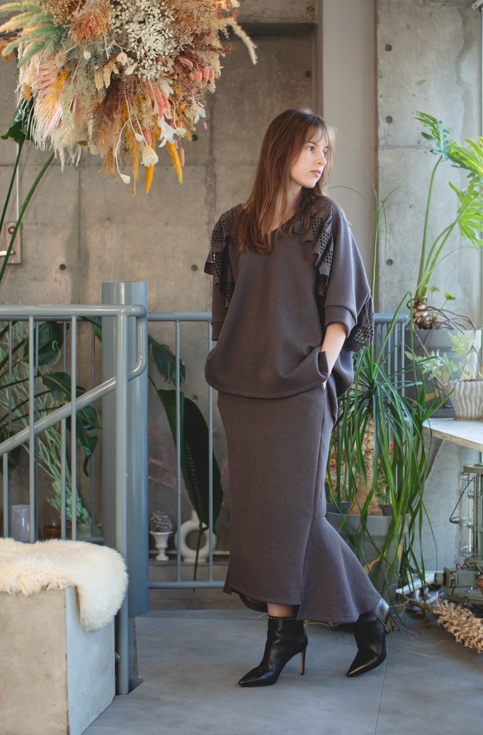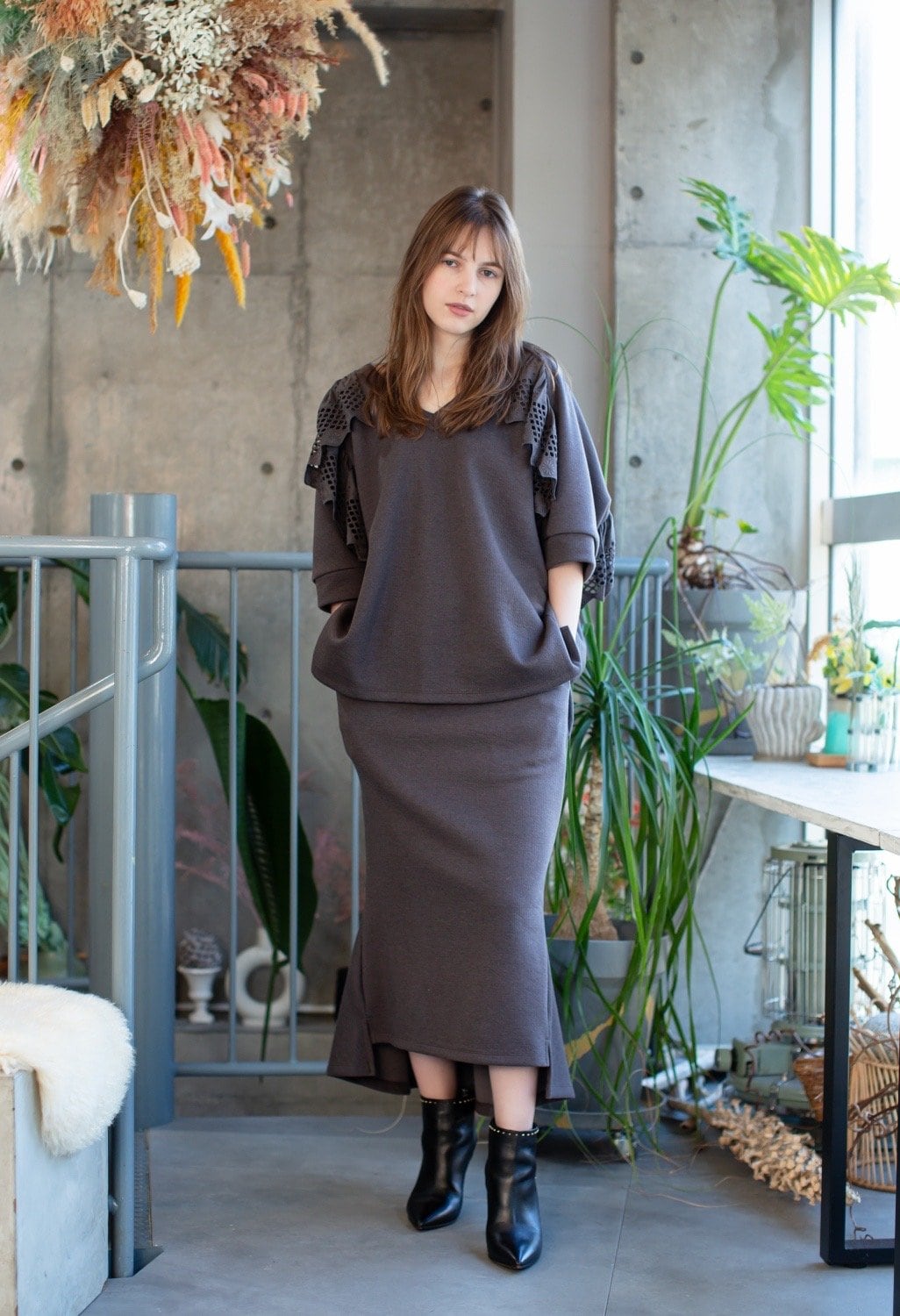丸みを帯びたシルエットは立体的なパターンで、どの角度からもゆるめのシルエットが可愛いトップスとマーメイドシルエットが新鮮なスカートのSETUPです♡