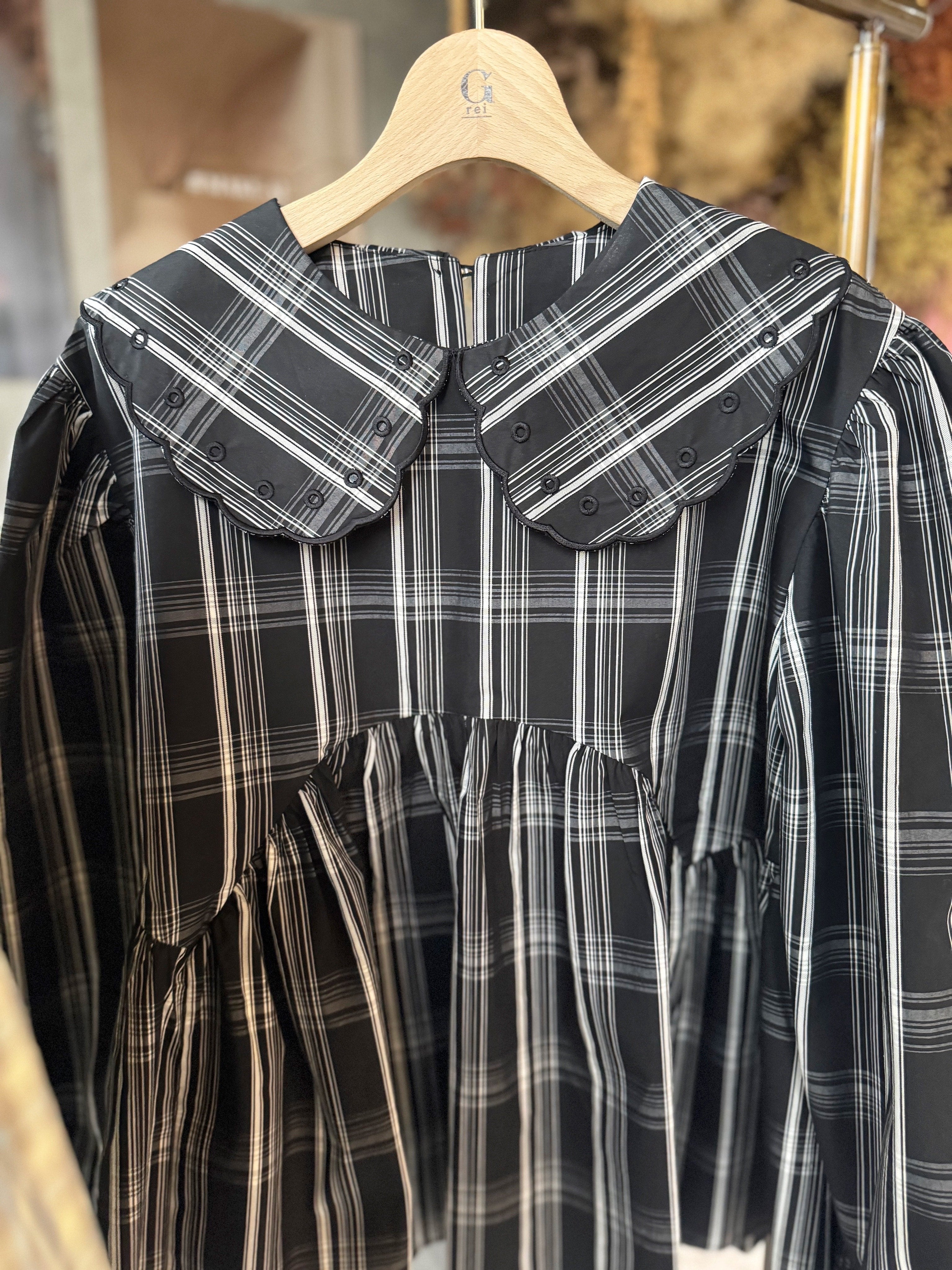 衿にスカラップ刺繍がボリュームたっぷりのパフスリーブで可愛らしいトップスです。