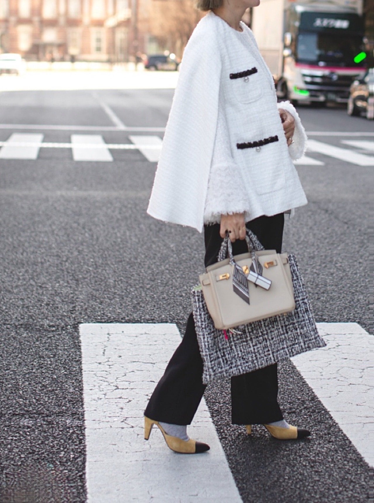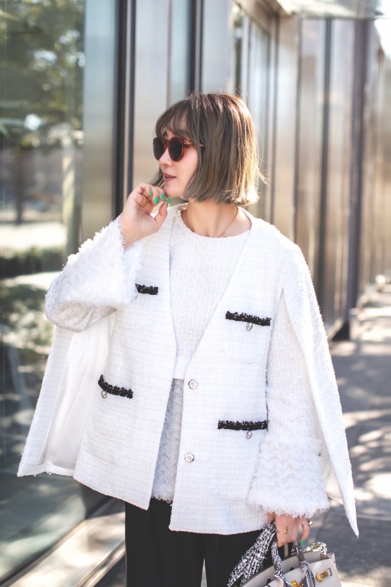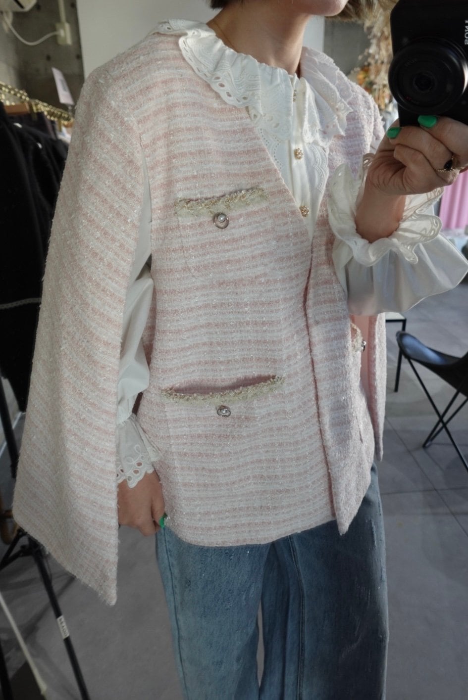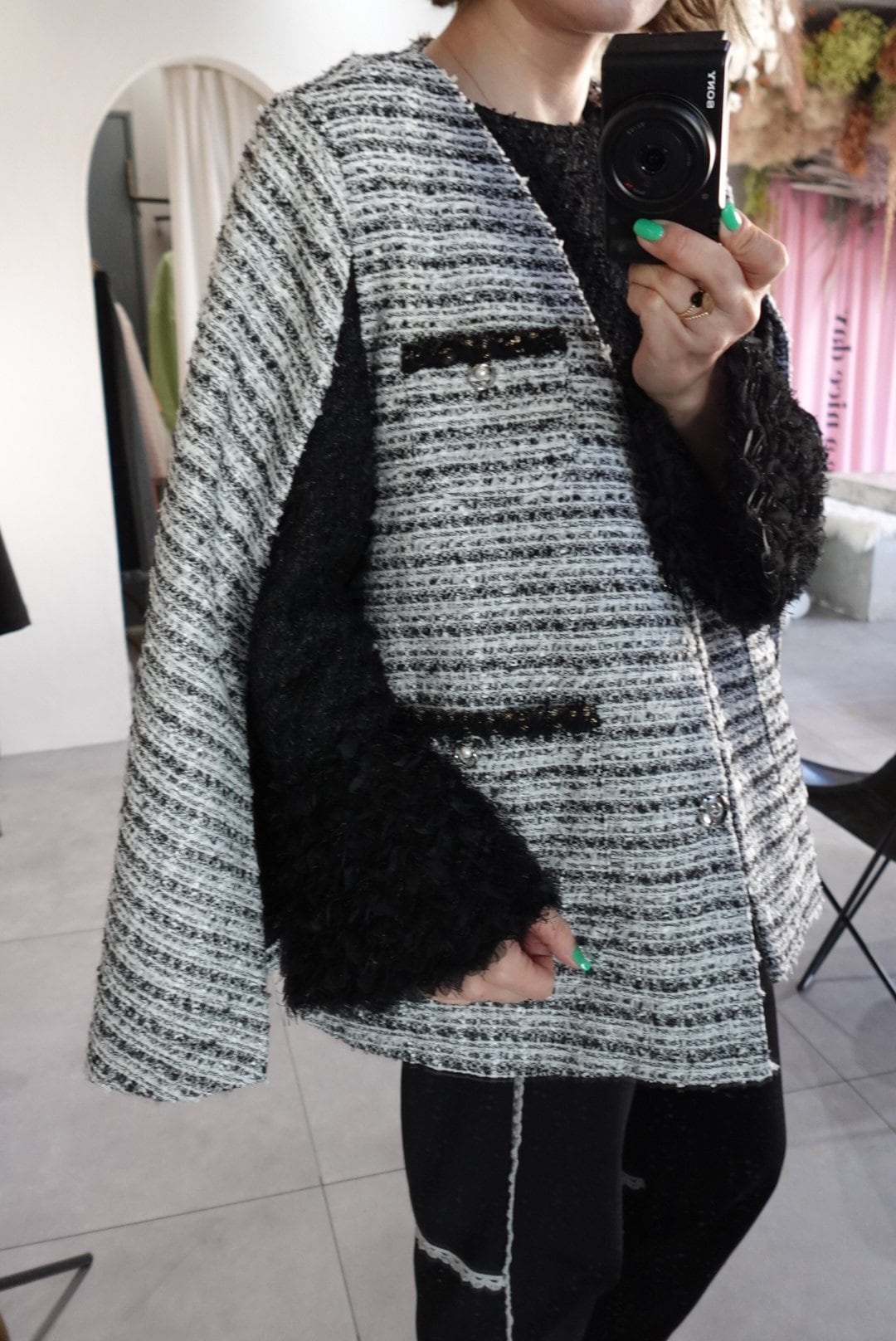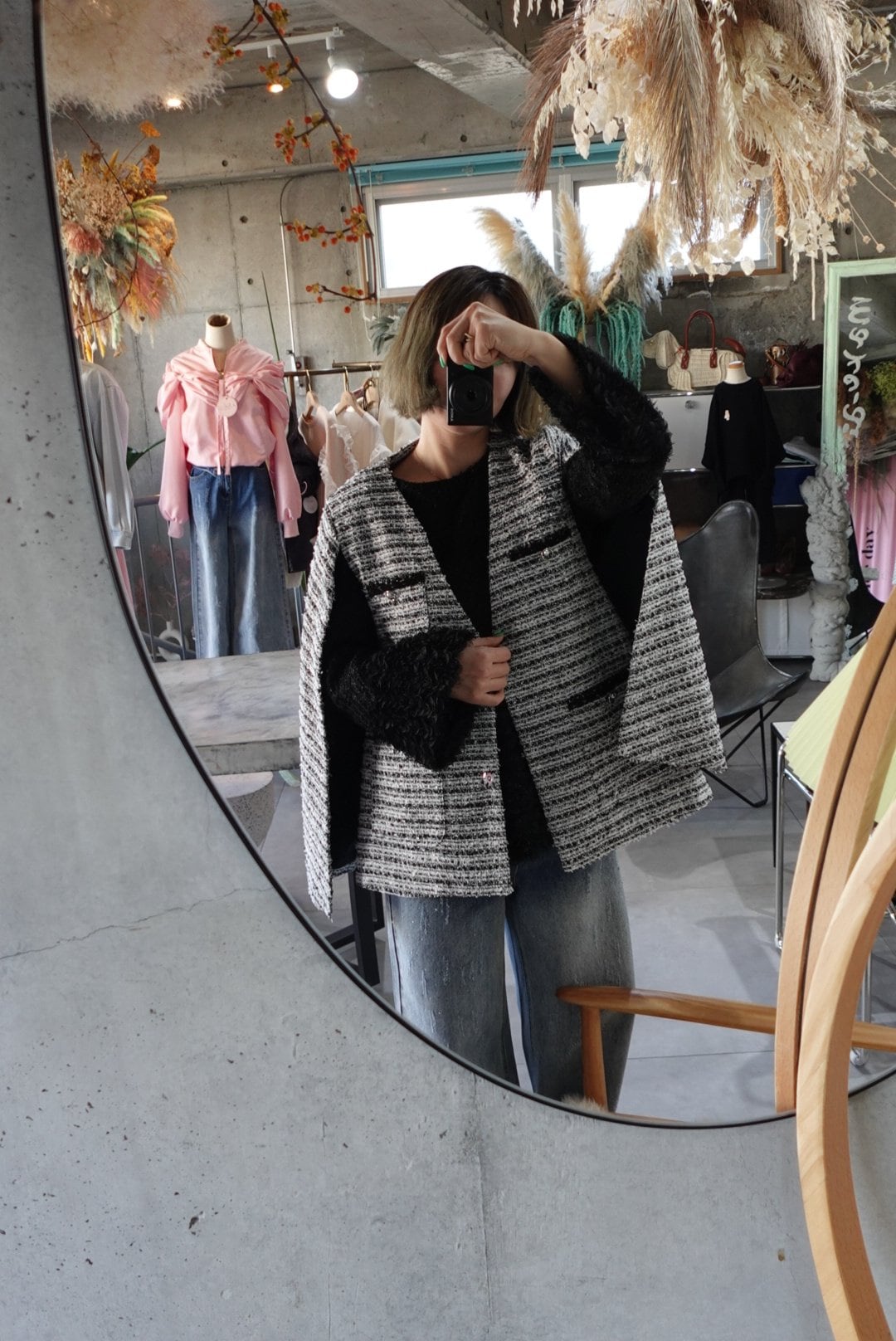 しっかりした高級なツイード生地やデザイン性の高いパールボタンは年齢問わず長く愛用していただけるアイテムです。