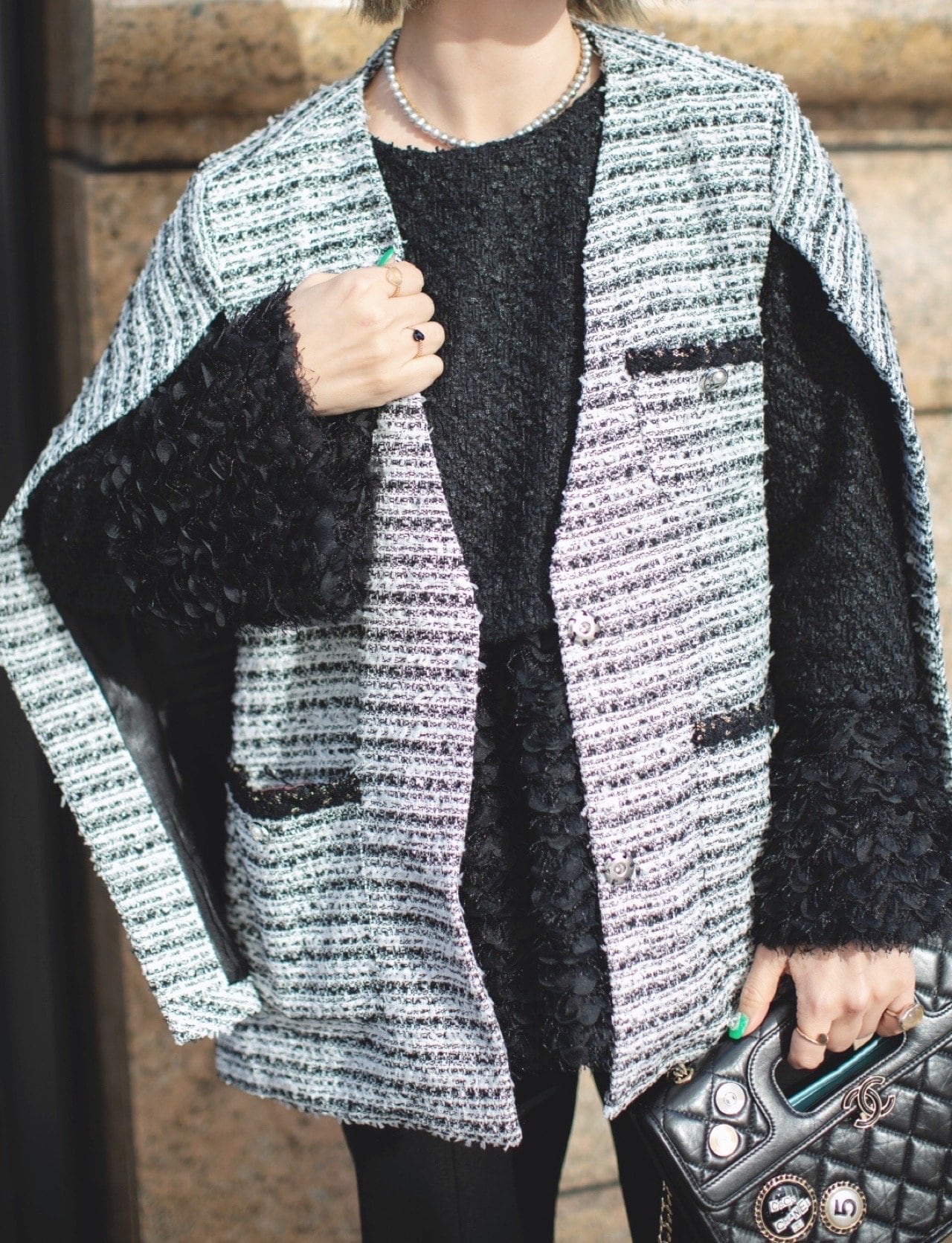 シンプルなスタイルにさっと羽織るだけで周りと差のつくモダンなスタイルへと昇華。アームホールがゆったりしているので、インナーにはドルマンやボリュームスリーブも問題なく着られるのもポンチョならでは♡