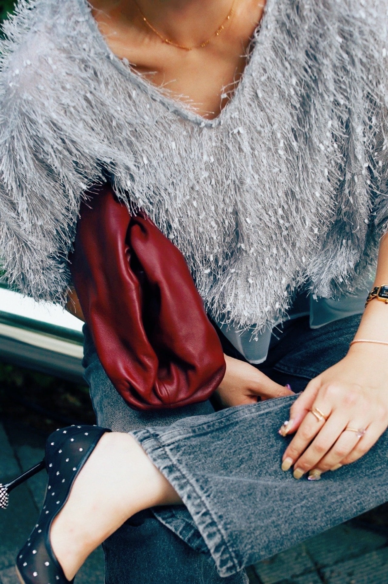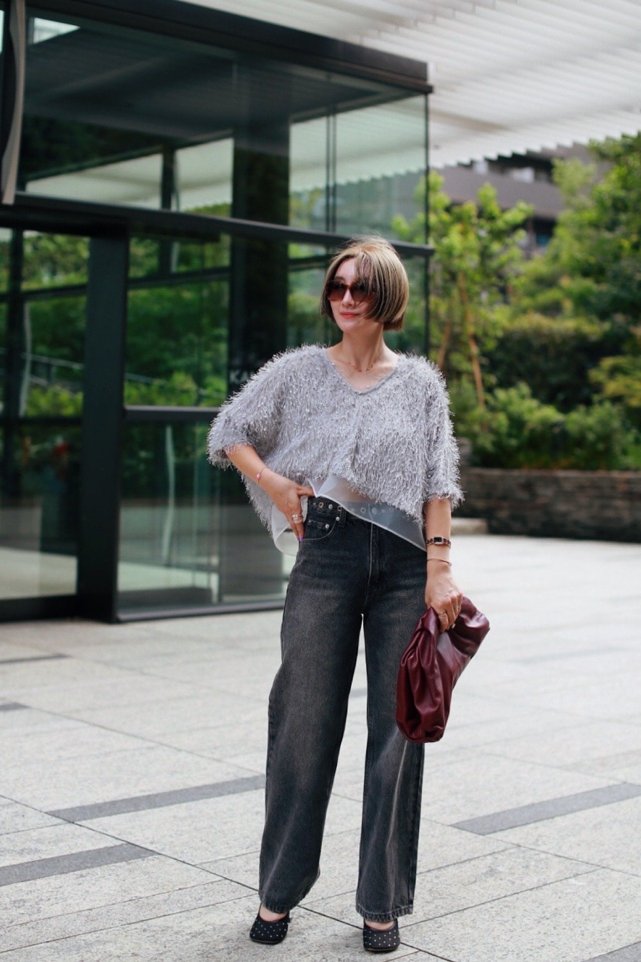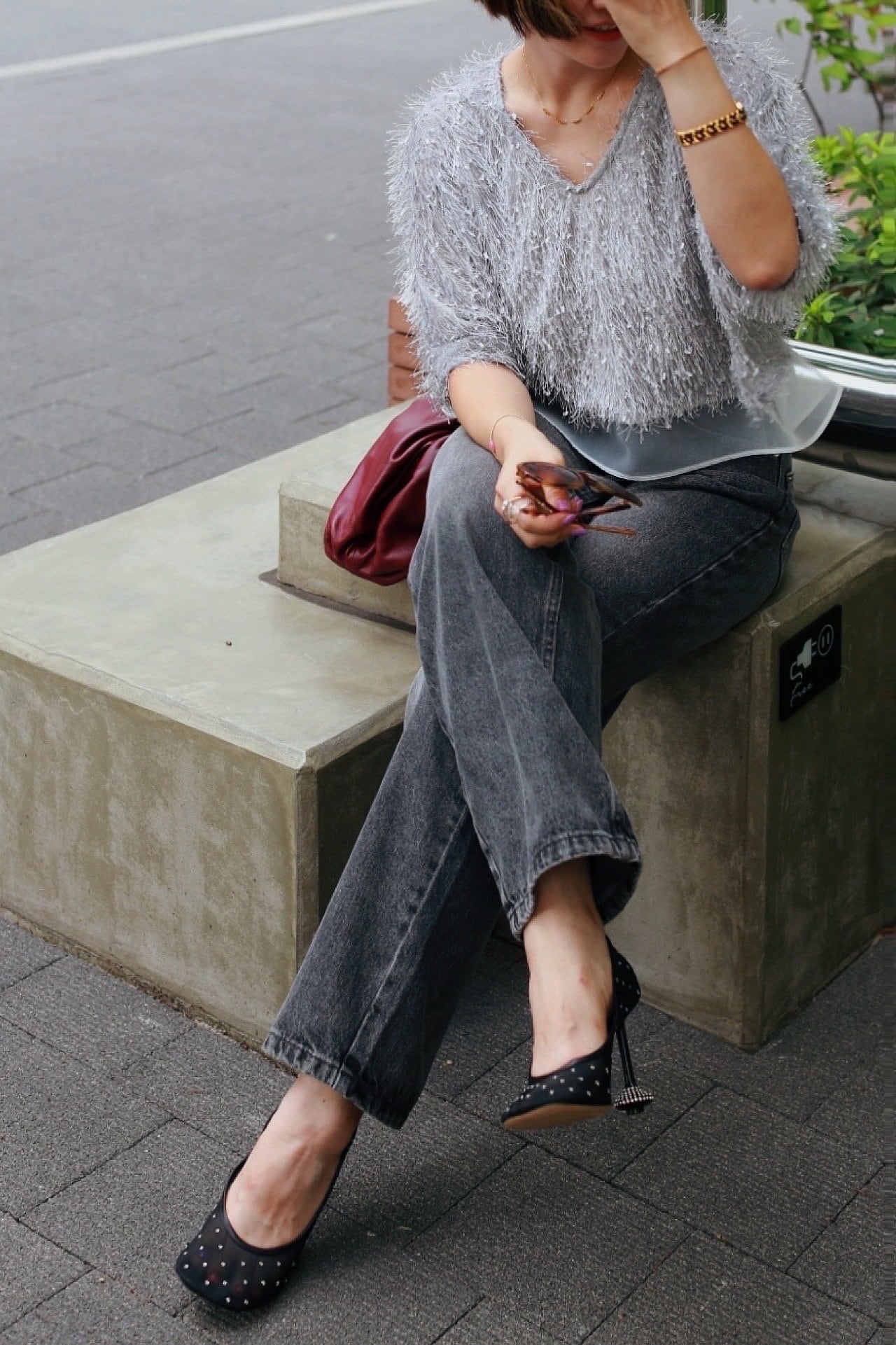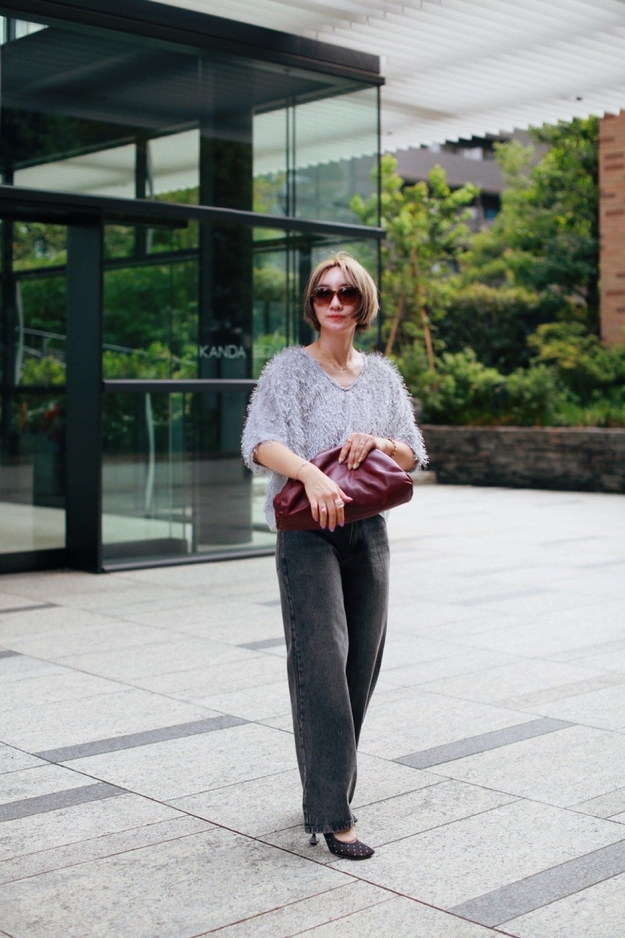 広めのVネックはデコルテをきれいに見せてくれて、またシアーなタートルネックやカジュアルなTシャツをインして着るのもオススメです。