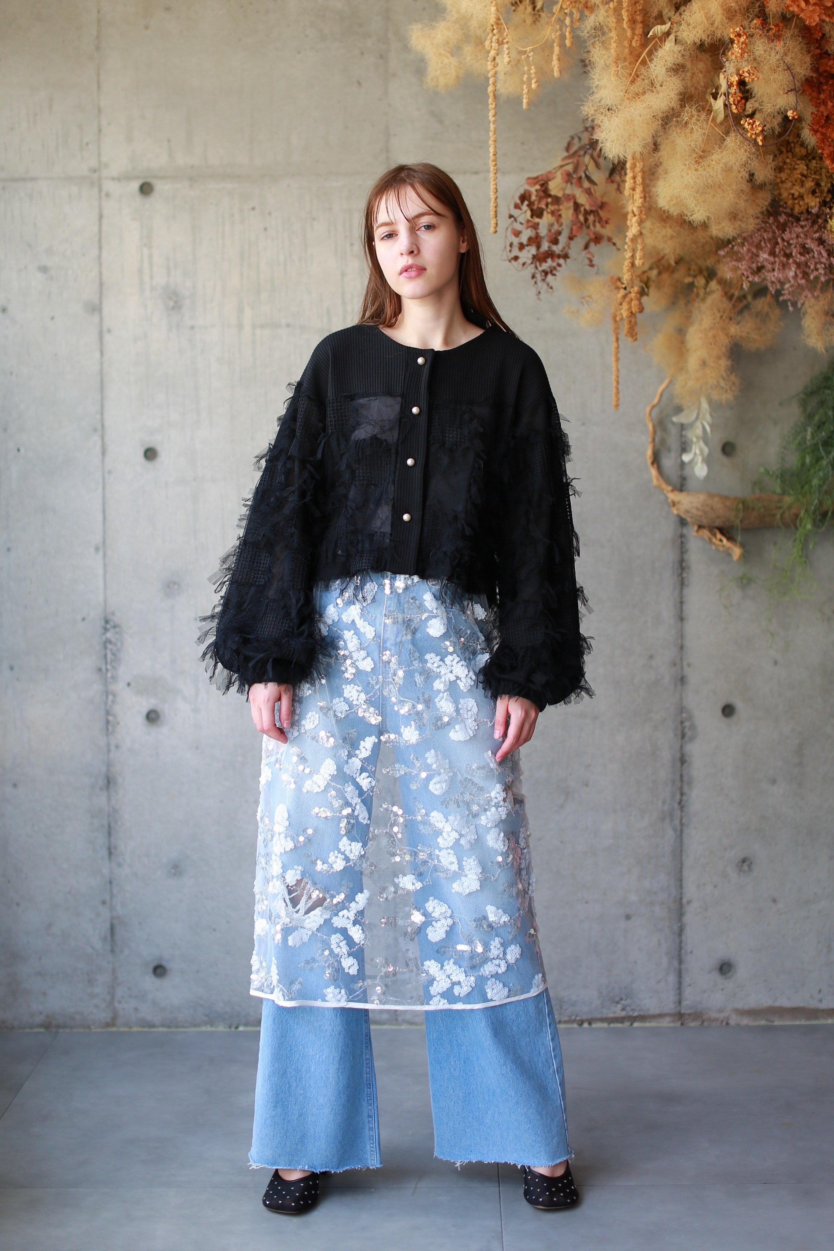 動きのあるフリンジチュール生地とカジュアルなワッフル生地をドッキングされたカーディガン。