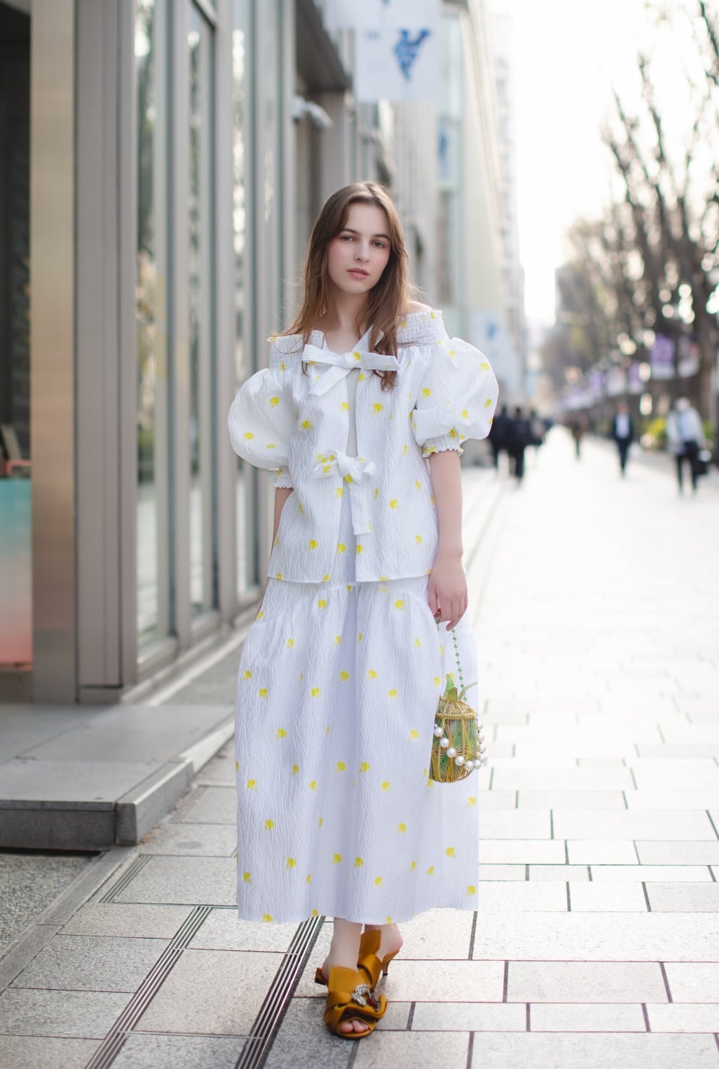 今の時期から夏まで着られるカラーと生地感。しっかりめのジャカード生地はボリューム感たっぷり。
