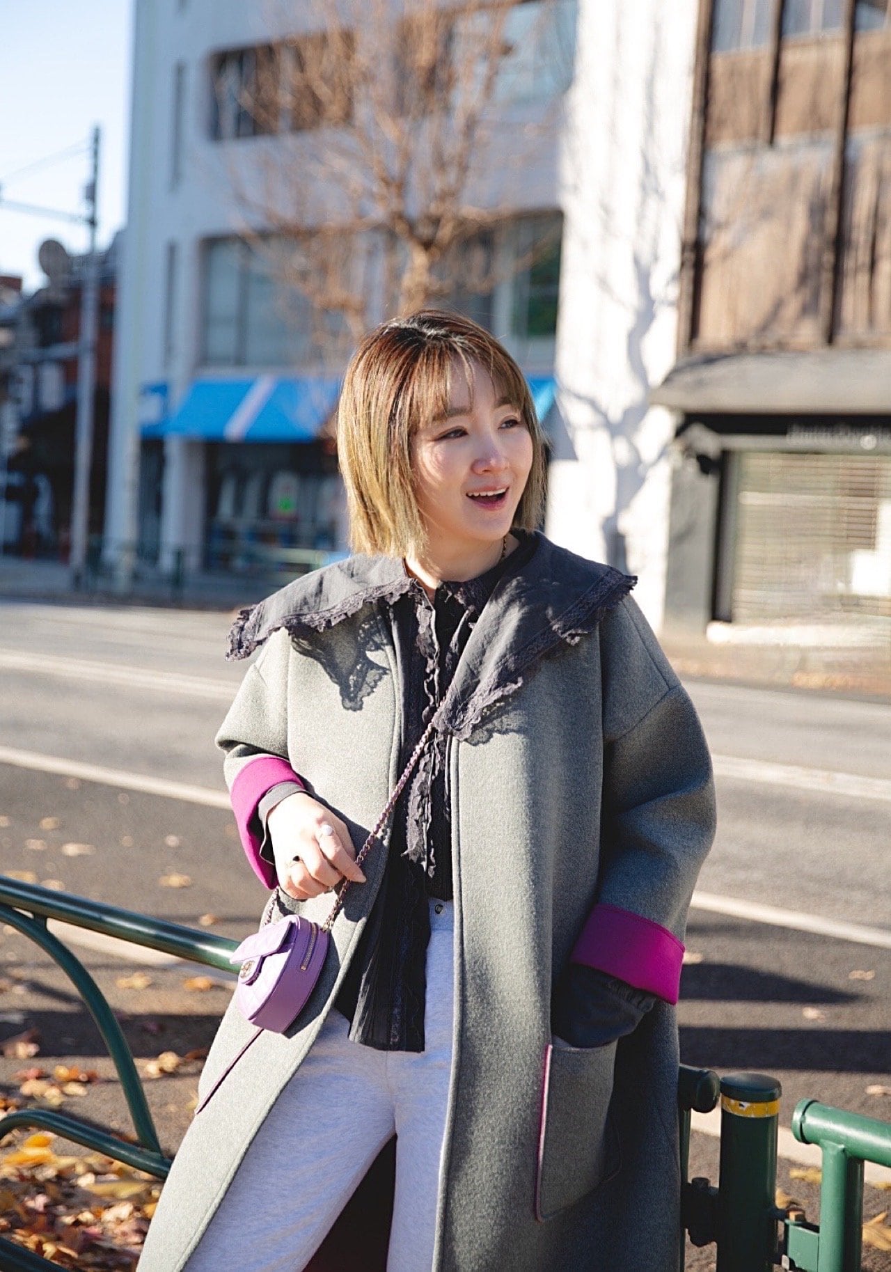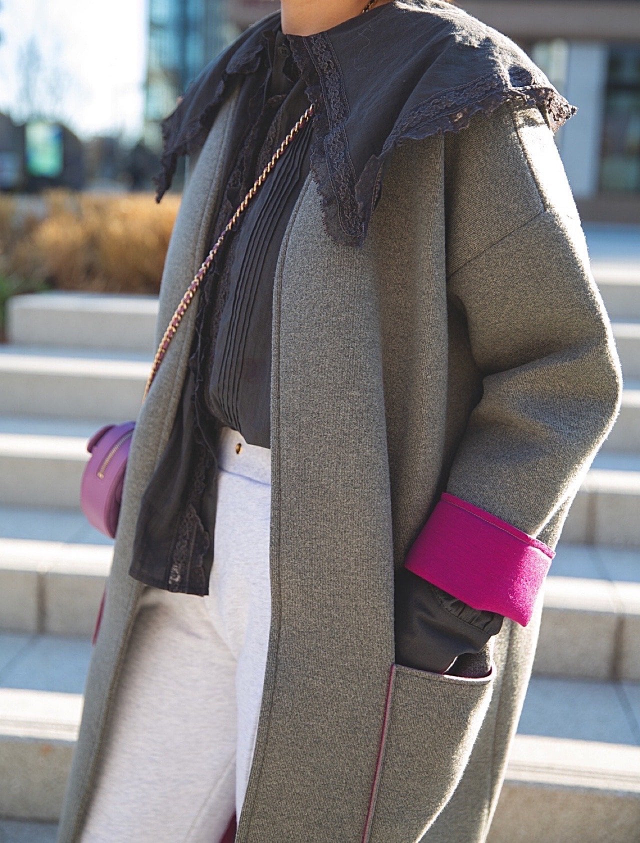 ノーカラーコートは形がシンプルなので、合わせるアイテムでコーデの幅が広がったり、コートのラインを強調したコーデができたりして、意外な楽しさがあります♡サイドスリット入りで重くなりすぎず楽ちんに着れます。