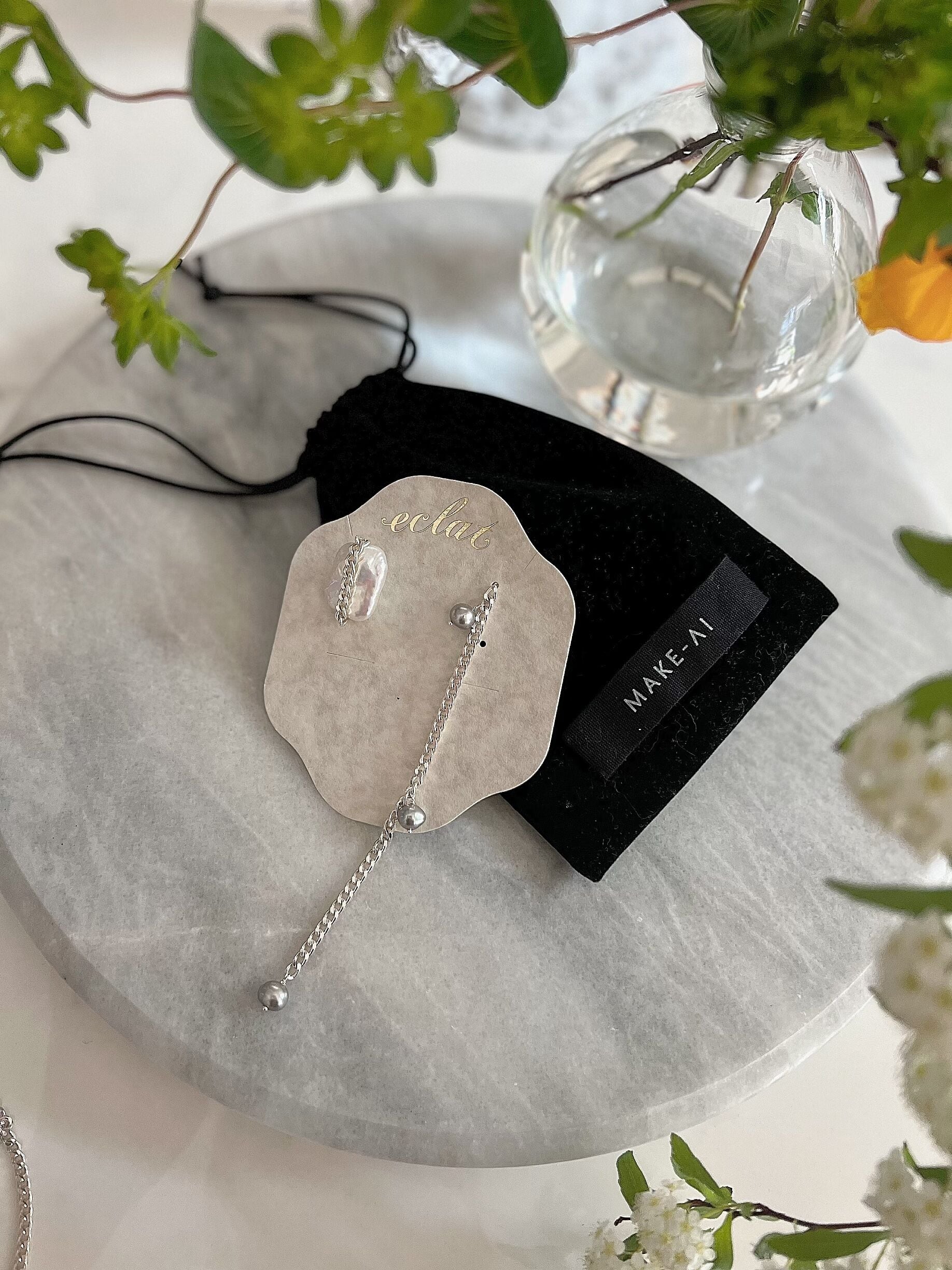 第4弾2つ目はグレー淡水パール×silver925チェーン+ホワイトレクタングルパールアシンメトリーピアスです。