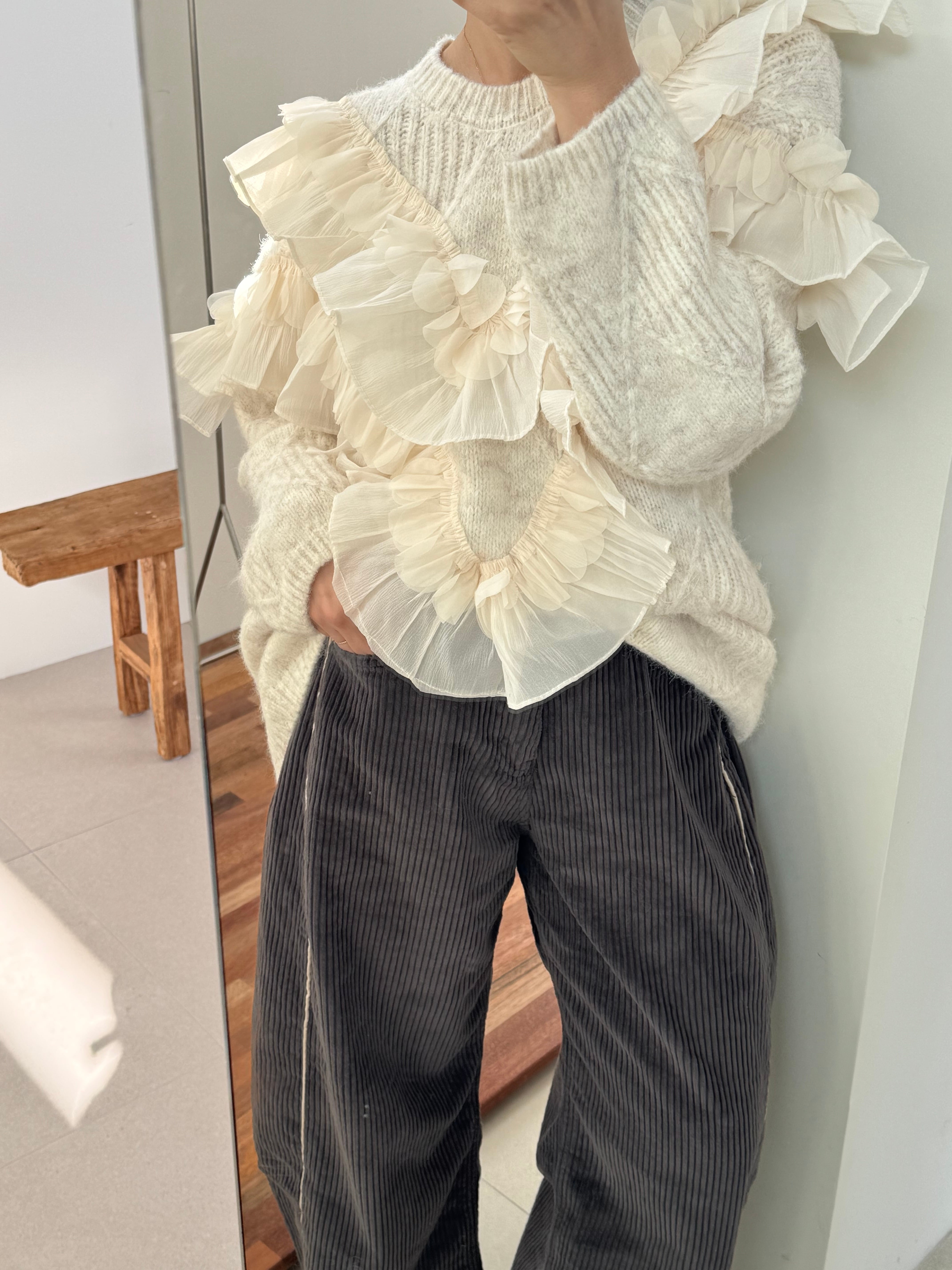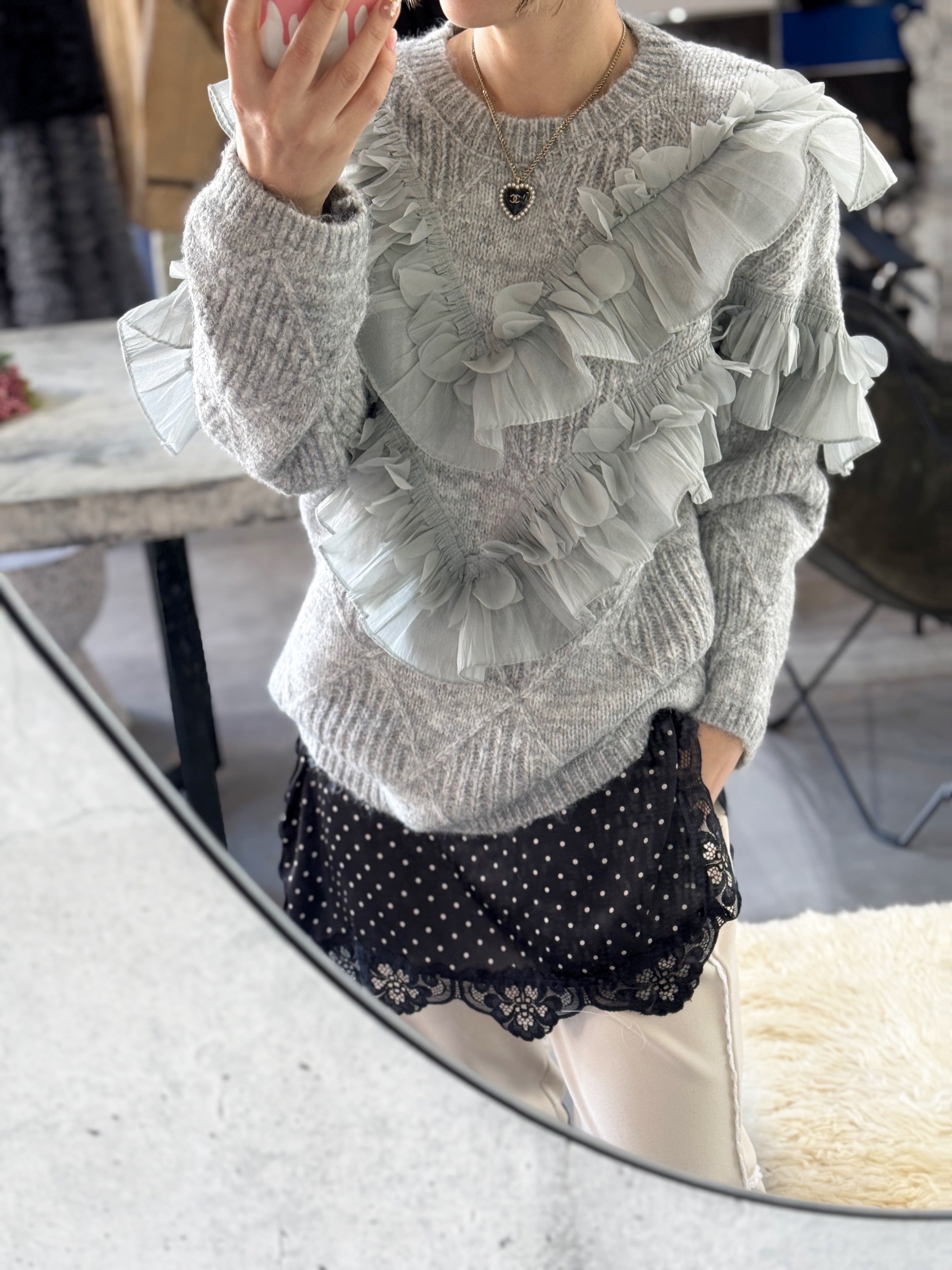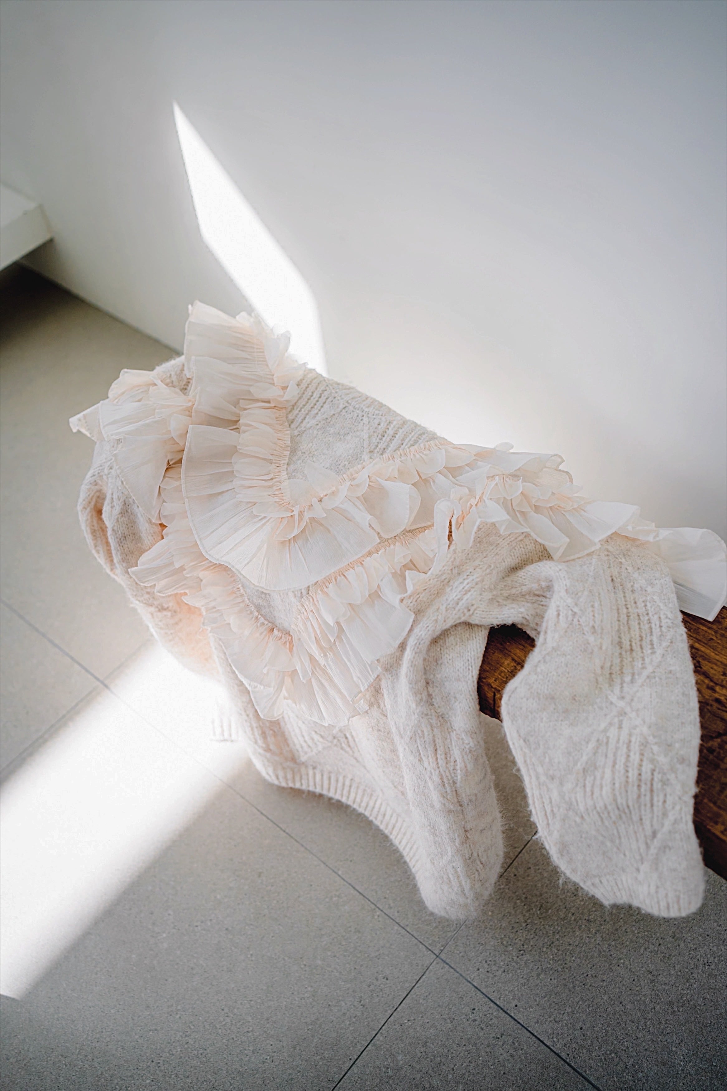 ざっくりと編まれたダイア柄リブ編みに、印象的な身頃のVラインにレースをドッキングしてヴィンテージニットのリメイクのようなリメイクのようなテイスト。