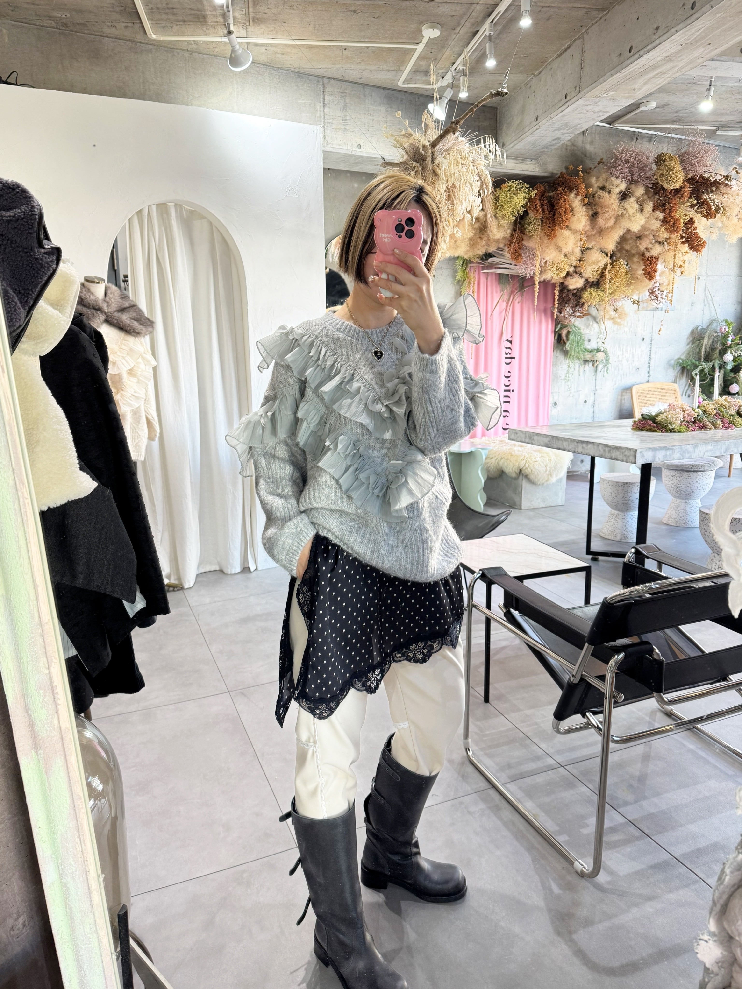 合わせるボトムスはデニムはもちろん、チュールスカートなど、ボリューミーで柔らかなデザインのスカートも相性抜群です。