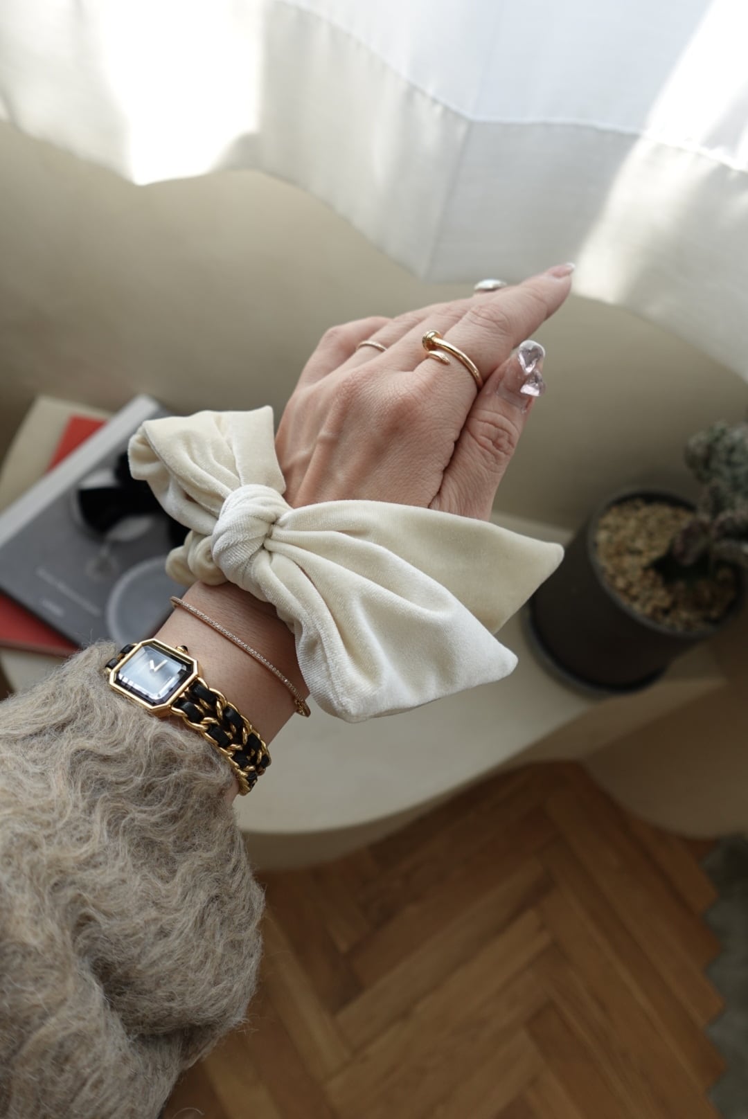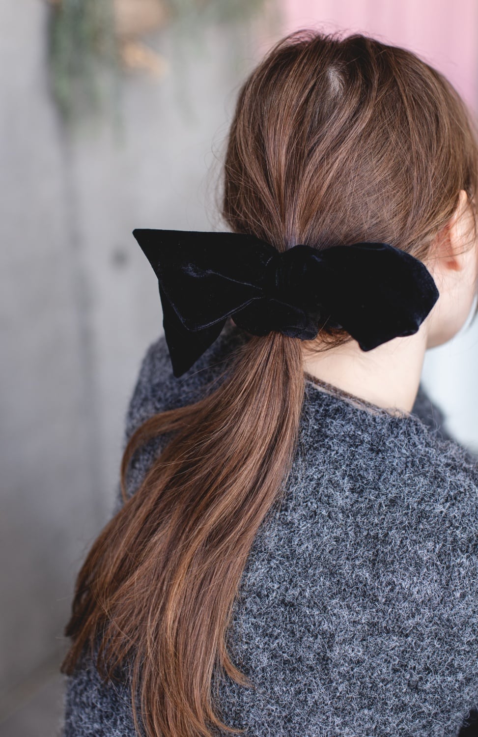 このシュシュは、しっとりとしたベロア素材が特徴で、光沢感がありつつも柔らかな手触りが楽しめます。リボンのデザインが可愛さを引き立て、ヘアスタイルに華やかさをプラスしてくれます♪