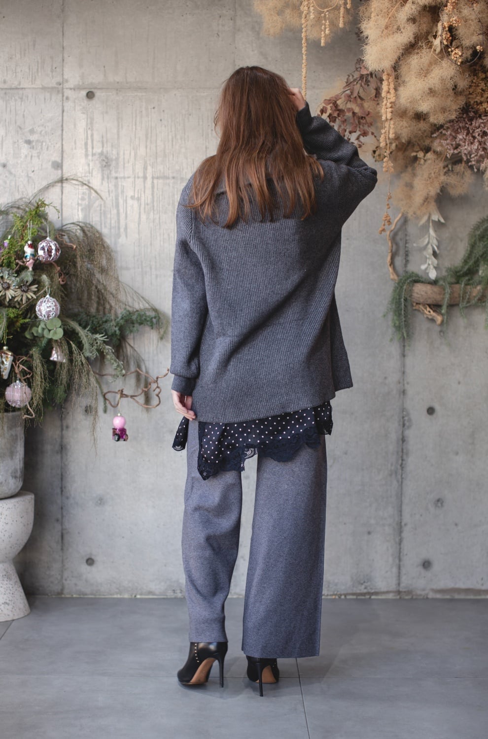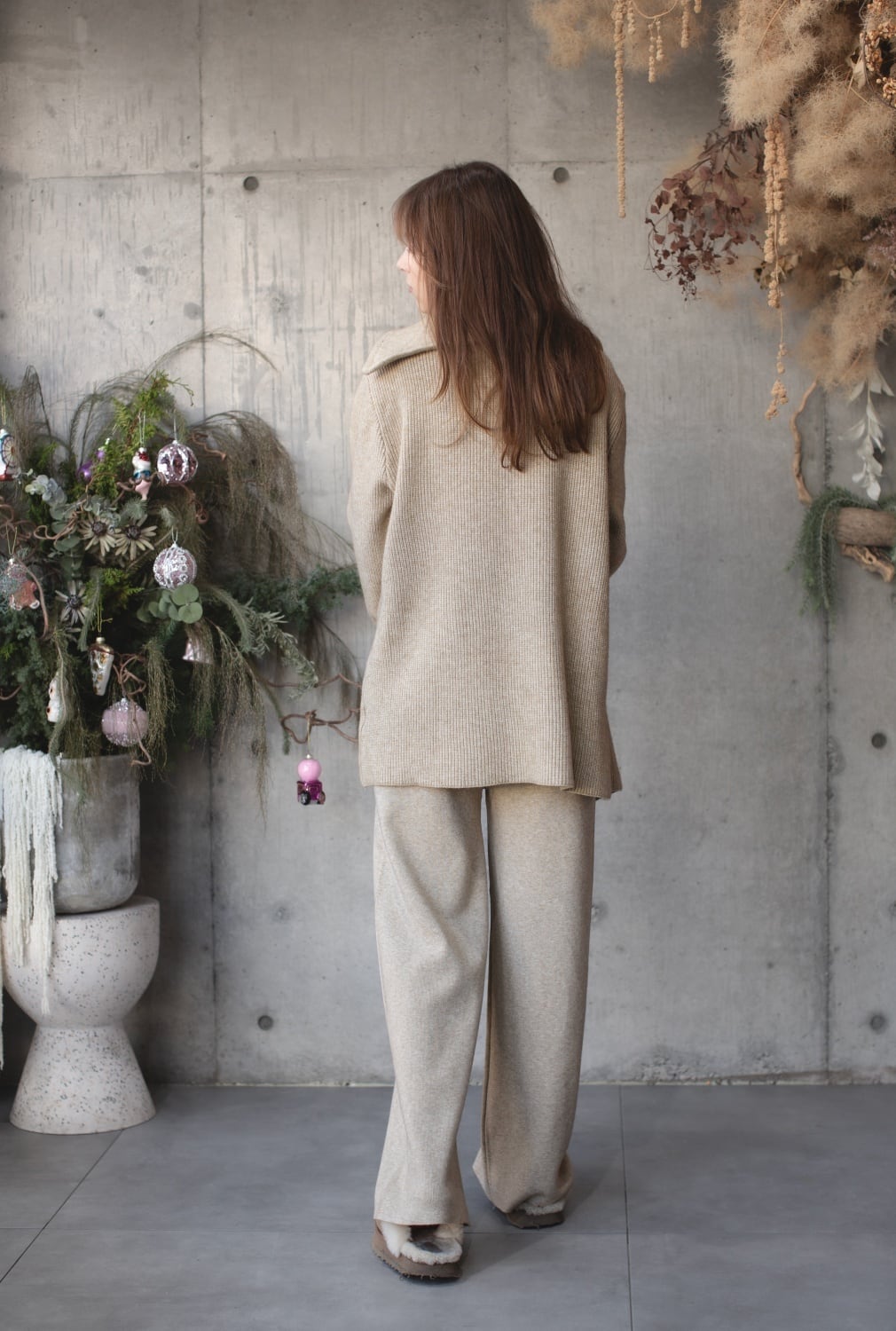 立体感のあるパターンで斜めのファスナーが魅力のタートルネックとストレートワイドなシルエットのパンツのセットになります。