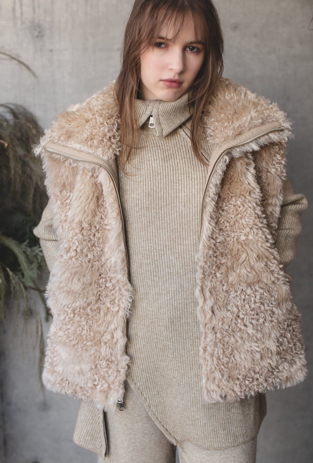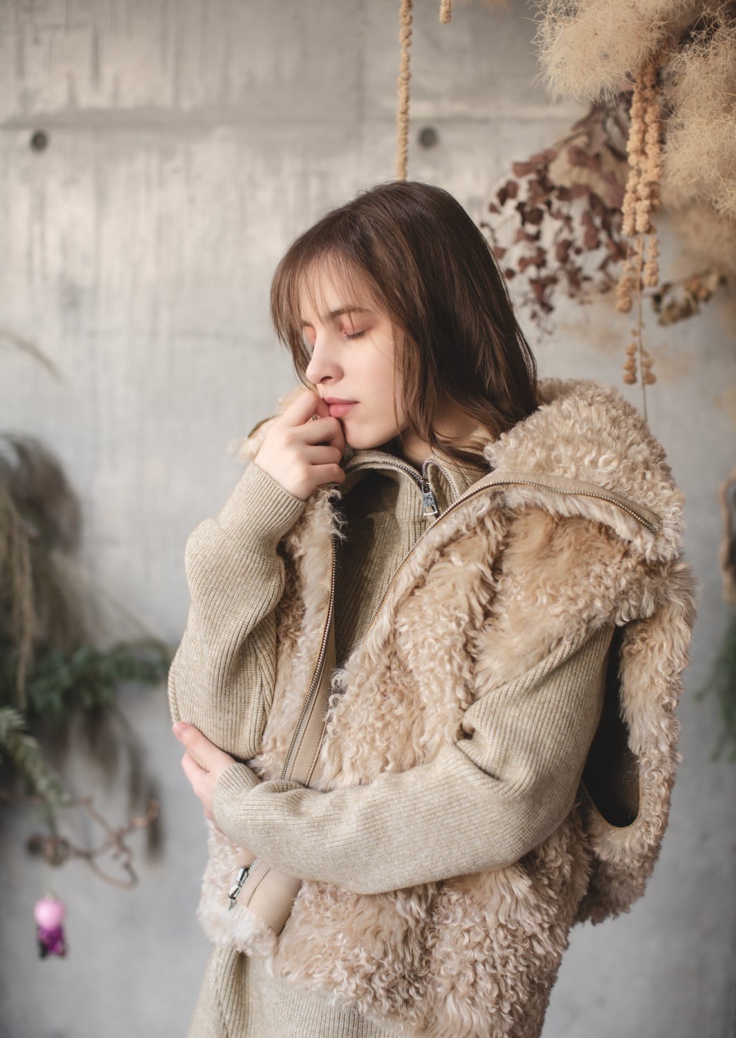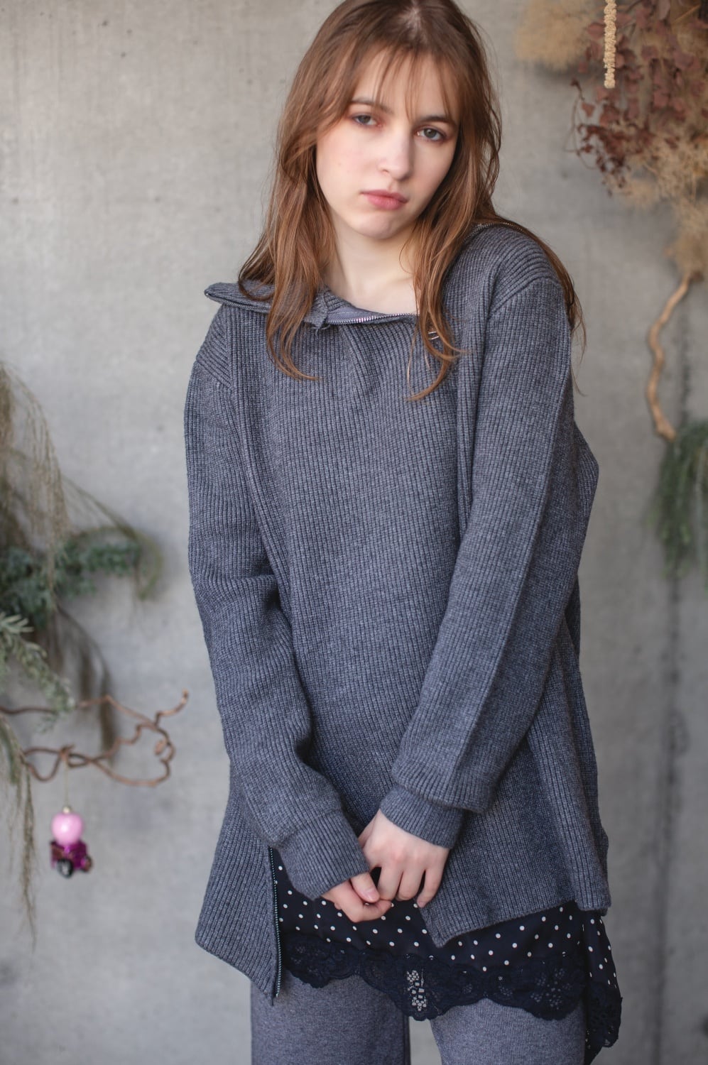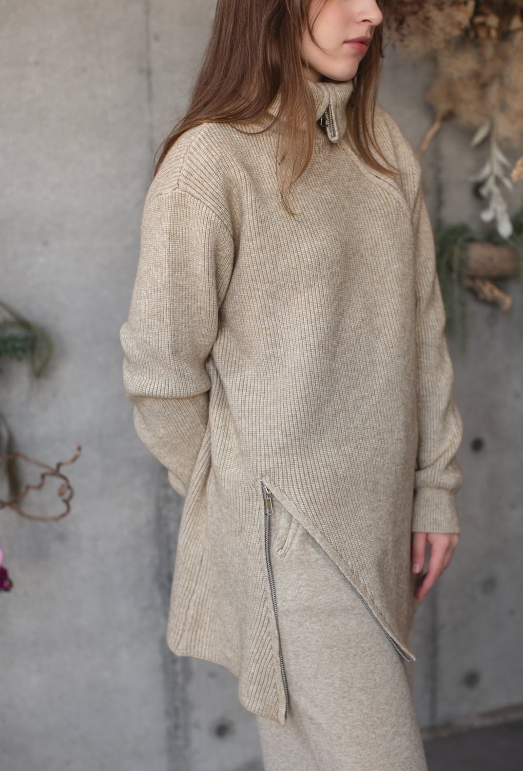タートルネックにドロップショルダーから流れるようにカーブした肩のラインが立体的なニットトップス。 斜めのファスナーをあけてデコルテをキレイにみせるのもおすすめな着こなしです♪
