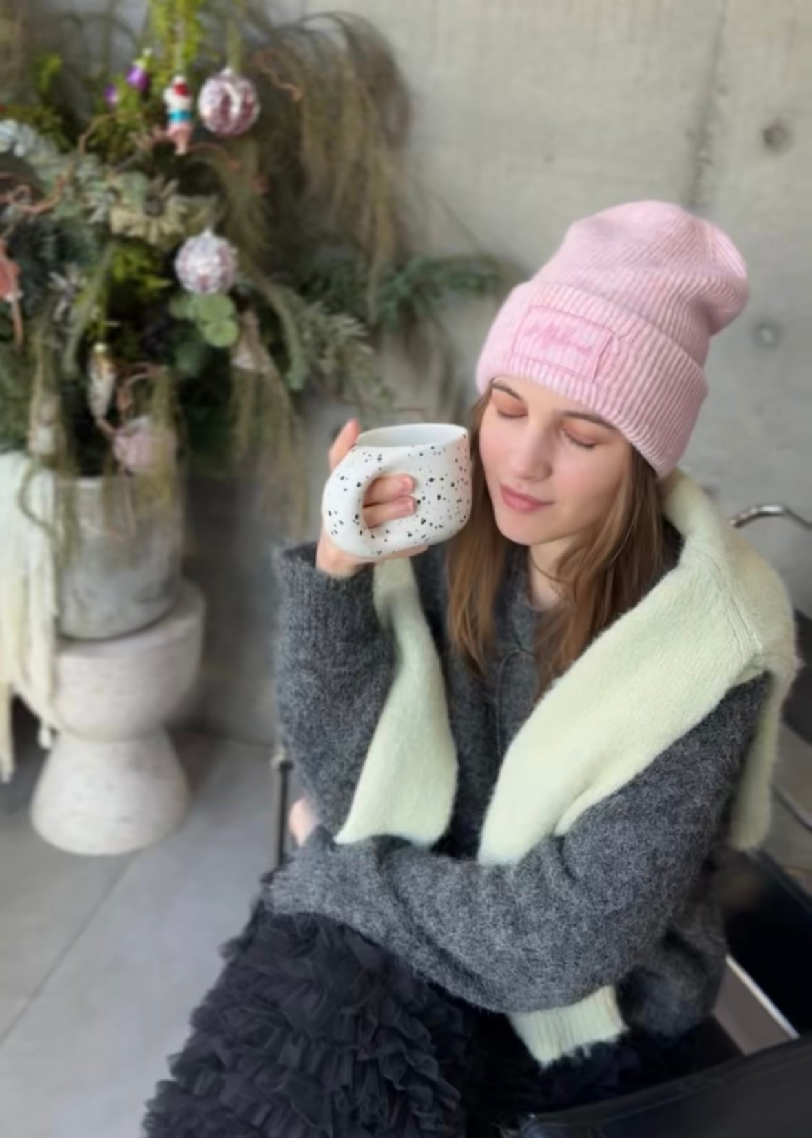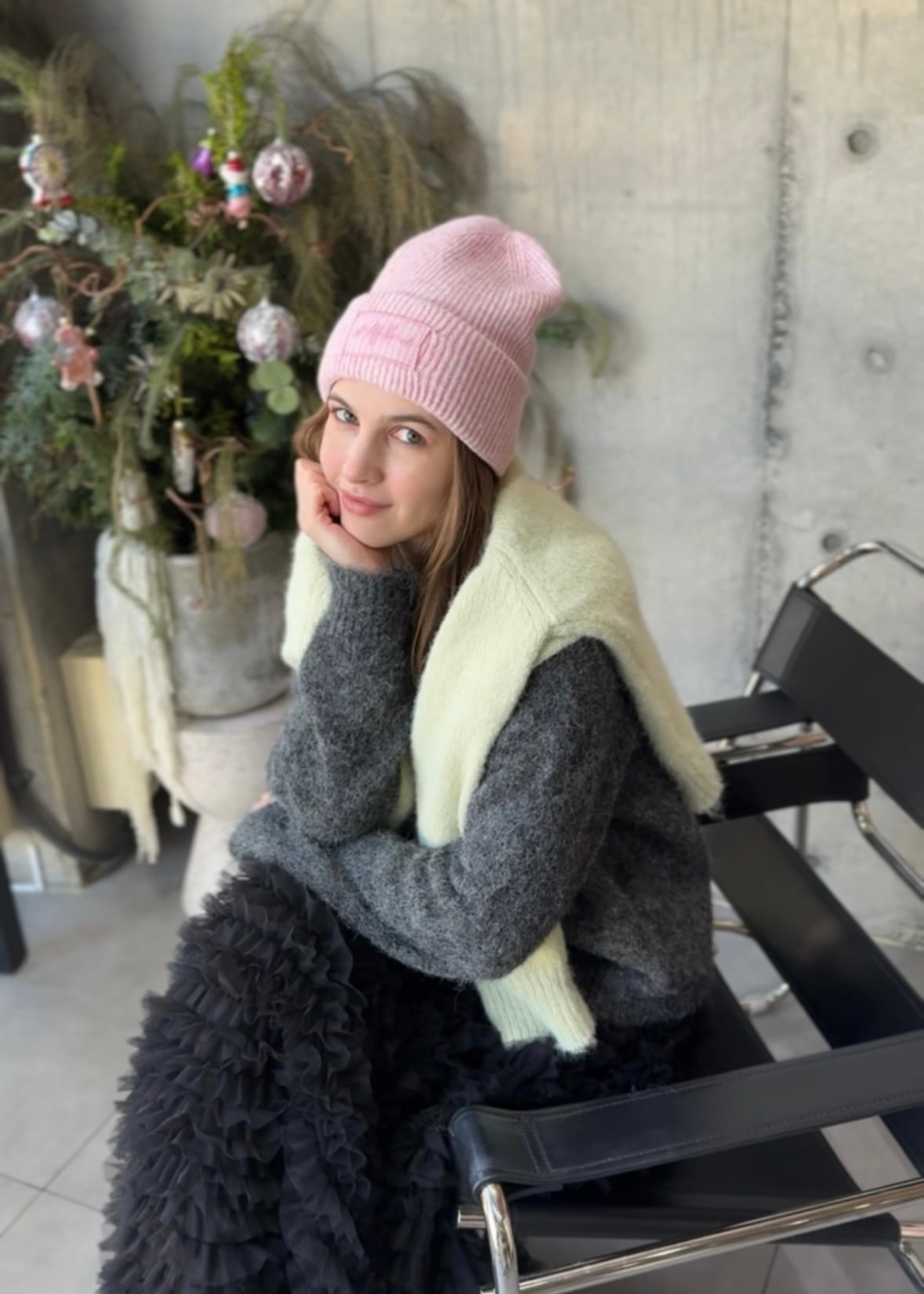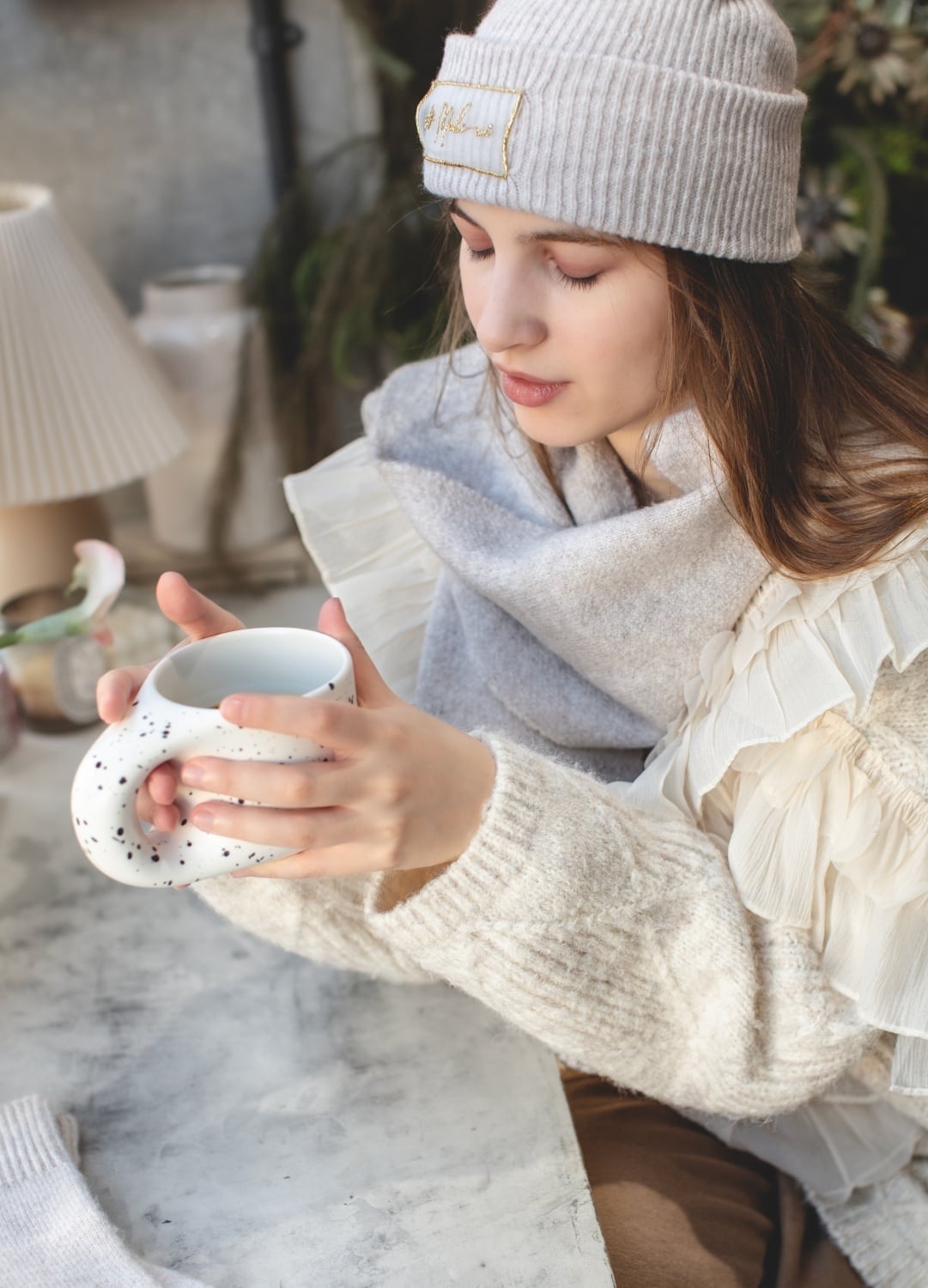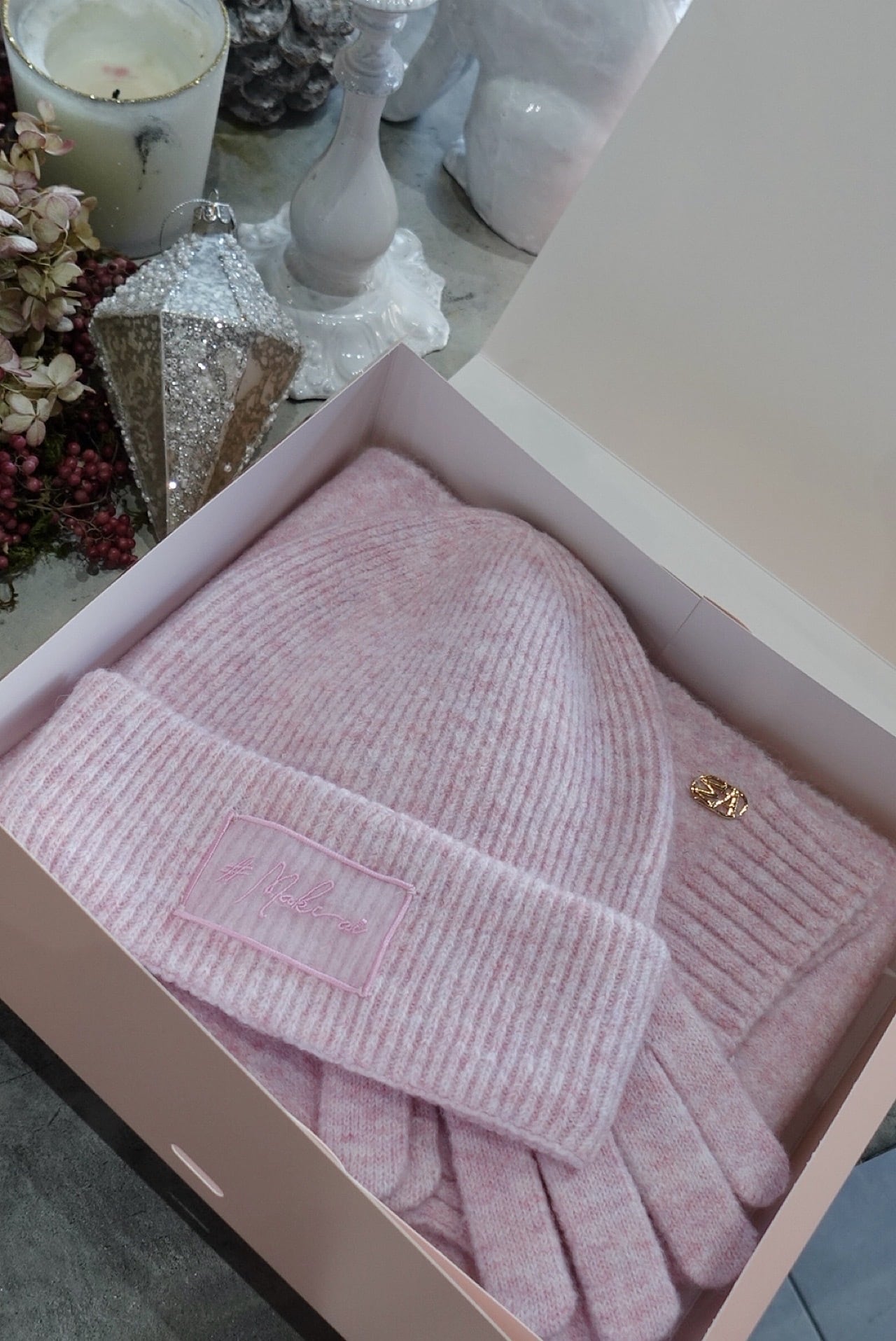 ウールをブレンドした柔らかくてシンプルなデザインのストール&ビーニー&手袋のセットです。