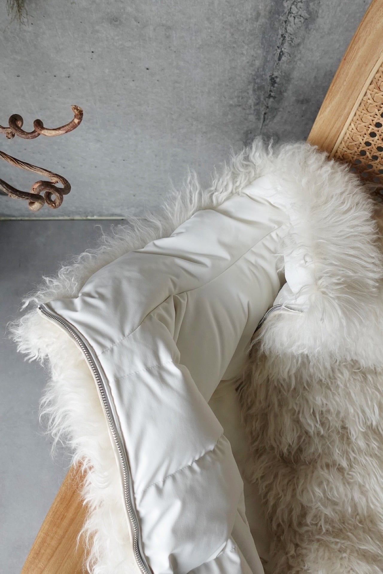 片面は柔らかなラムファー、もう片面は軽やかなグースダウンを使用しており、シンプルながらも存在感のあるデザイン。
