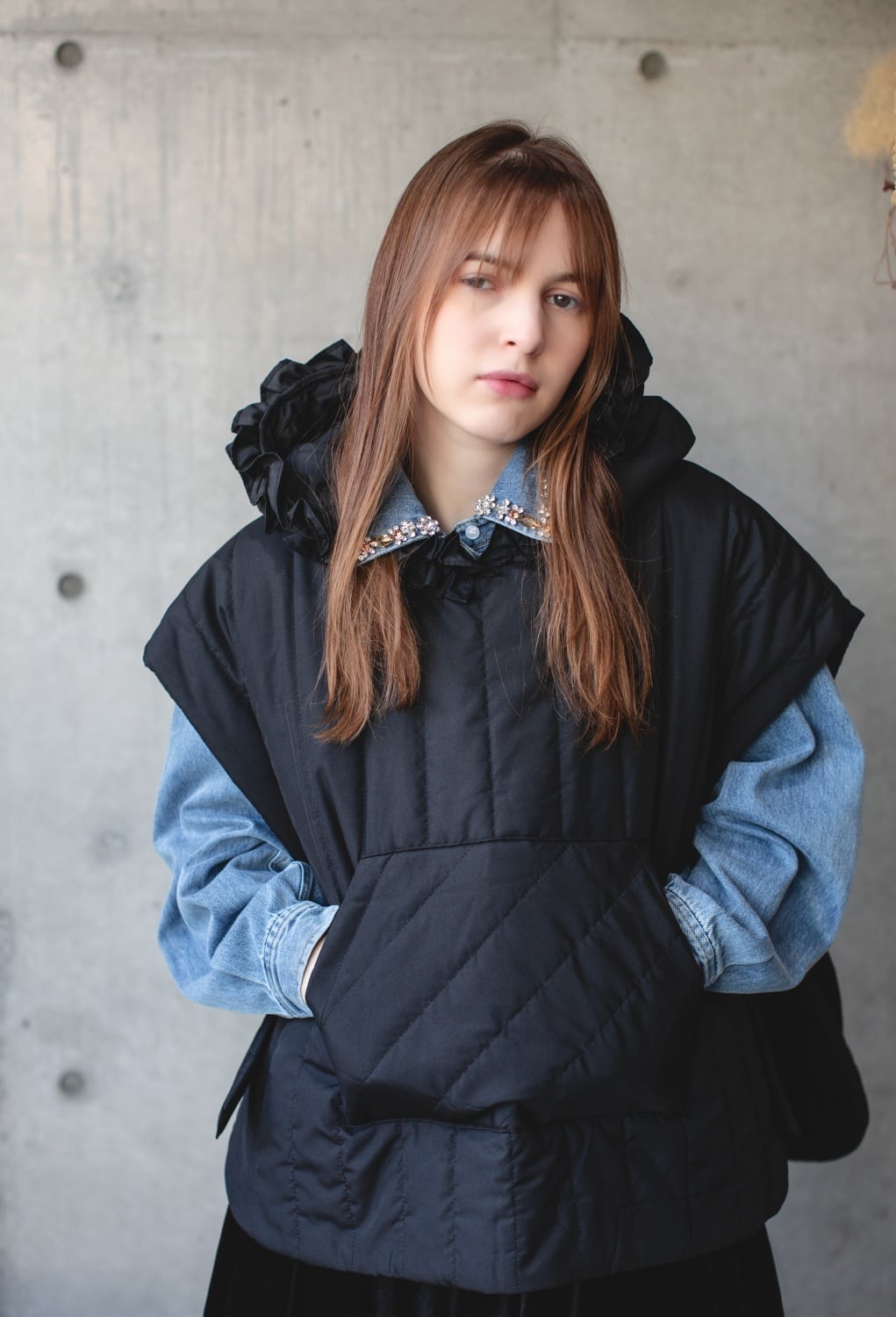 フードについてるフリルのディテールがフェミニンさを引き立て、着るだけで気分が上がりますよ◎