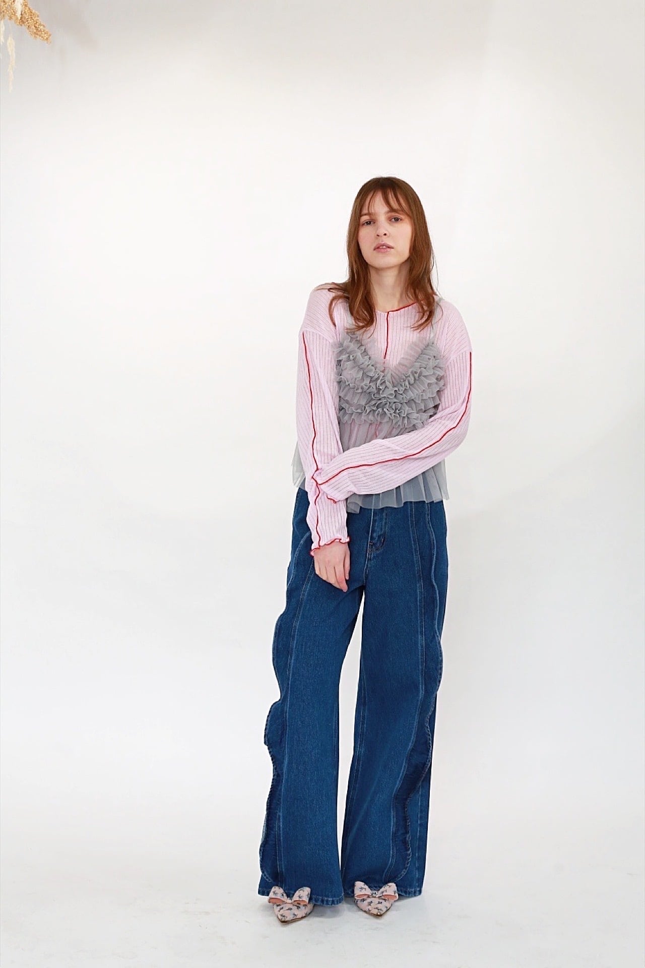 新たなスタイルを楽しめる「フリルデニム」は、縦に施されたフリルが特徴的なデニムパンツです。