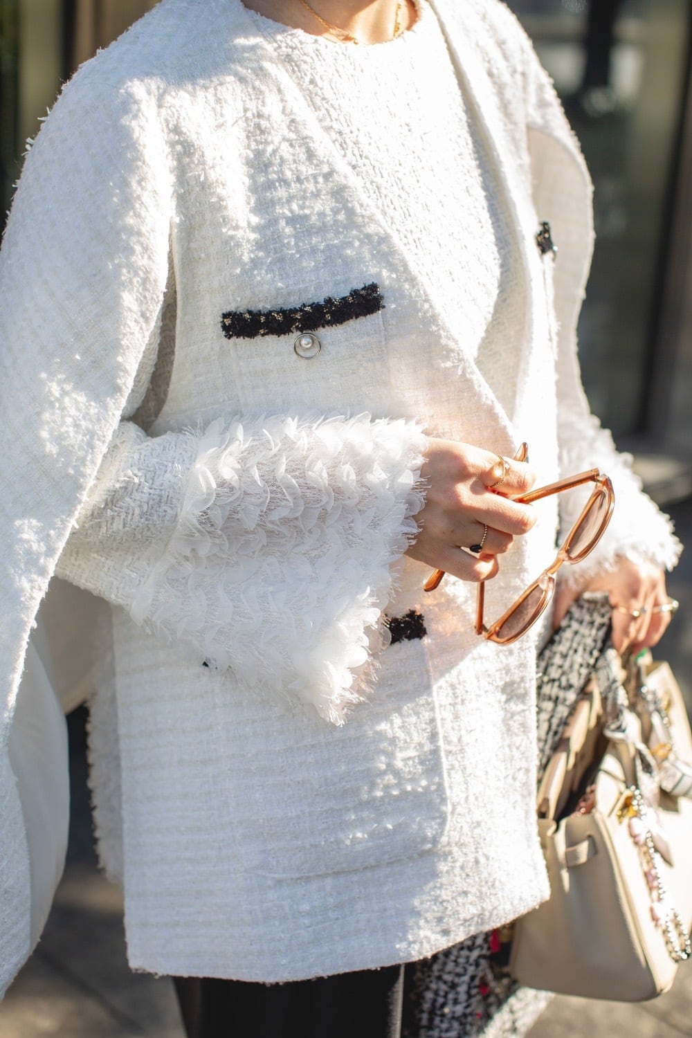 きちんと感のあるツイード生地に、フリンジドッキングデザインが女性らしさを引き立ててくれるツイードブラウス。