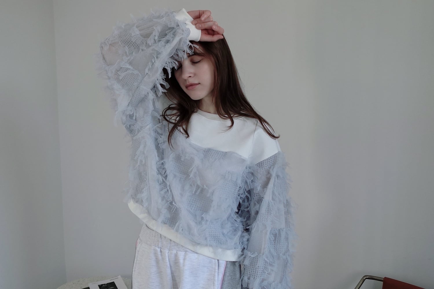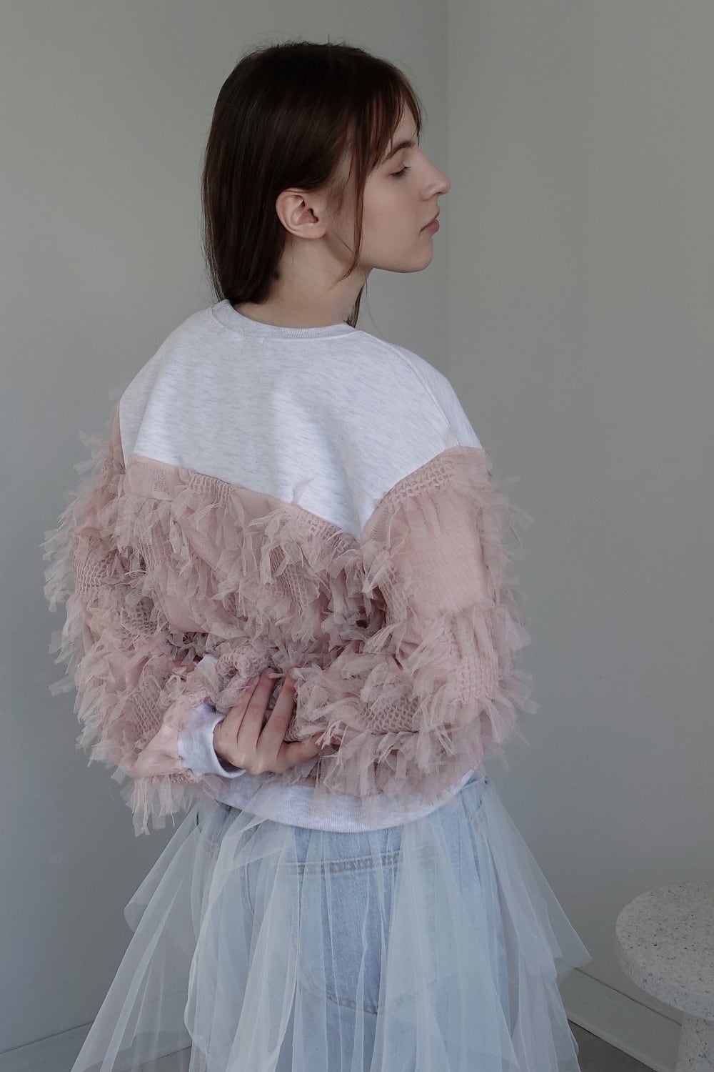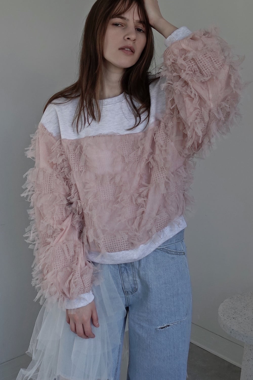 動きのあるフリンジチュール生地とカジュアルなスウェット生地をドッキングされたトップス。