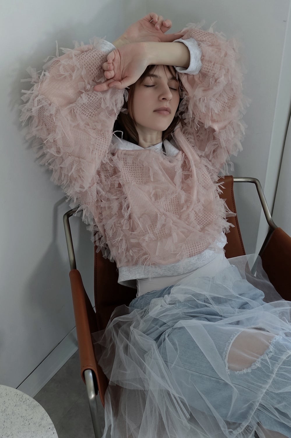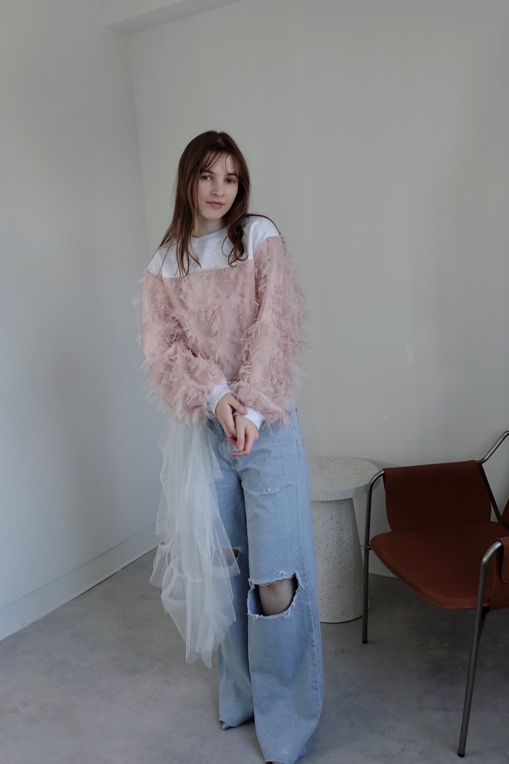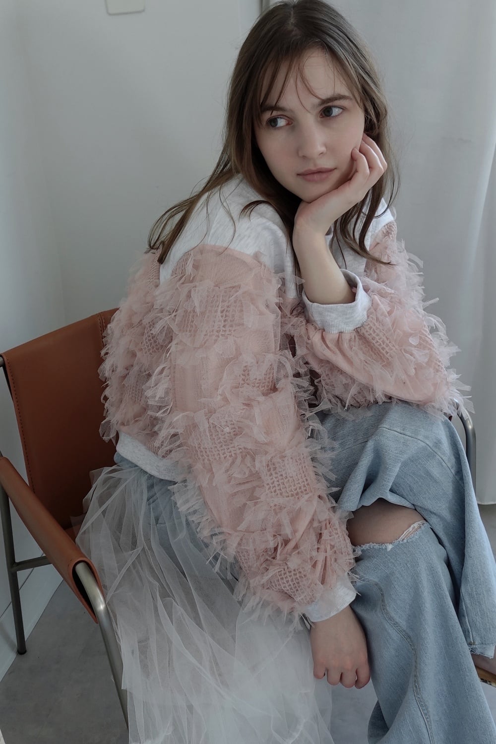 動きのあるフリンジチュール生地とカジュアルなスウェット生地をドッキングされたトップス。