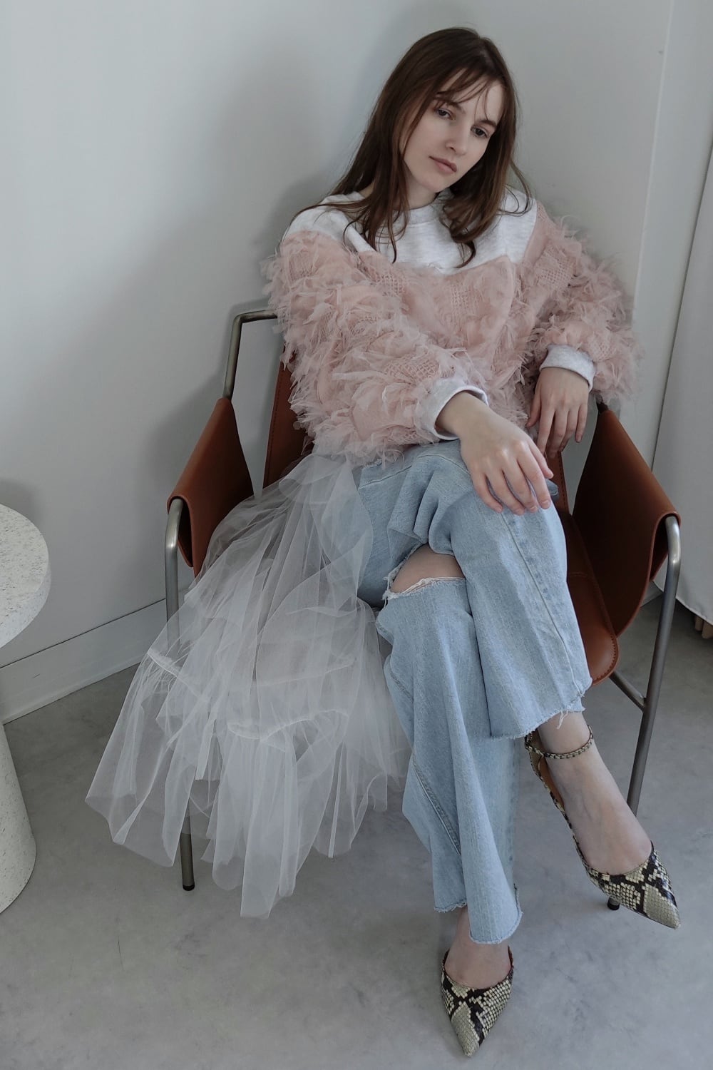 ( select)チュール付きダメージデニム