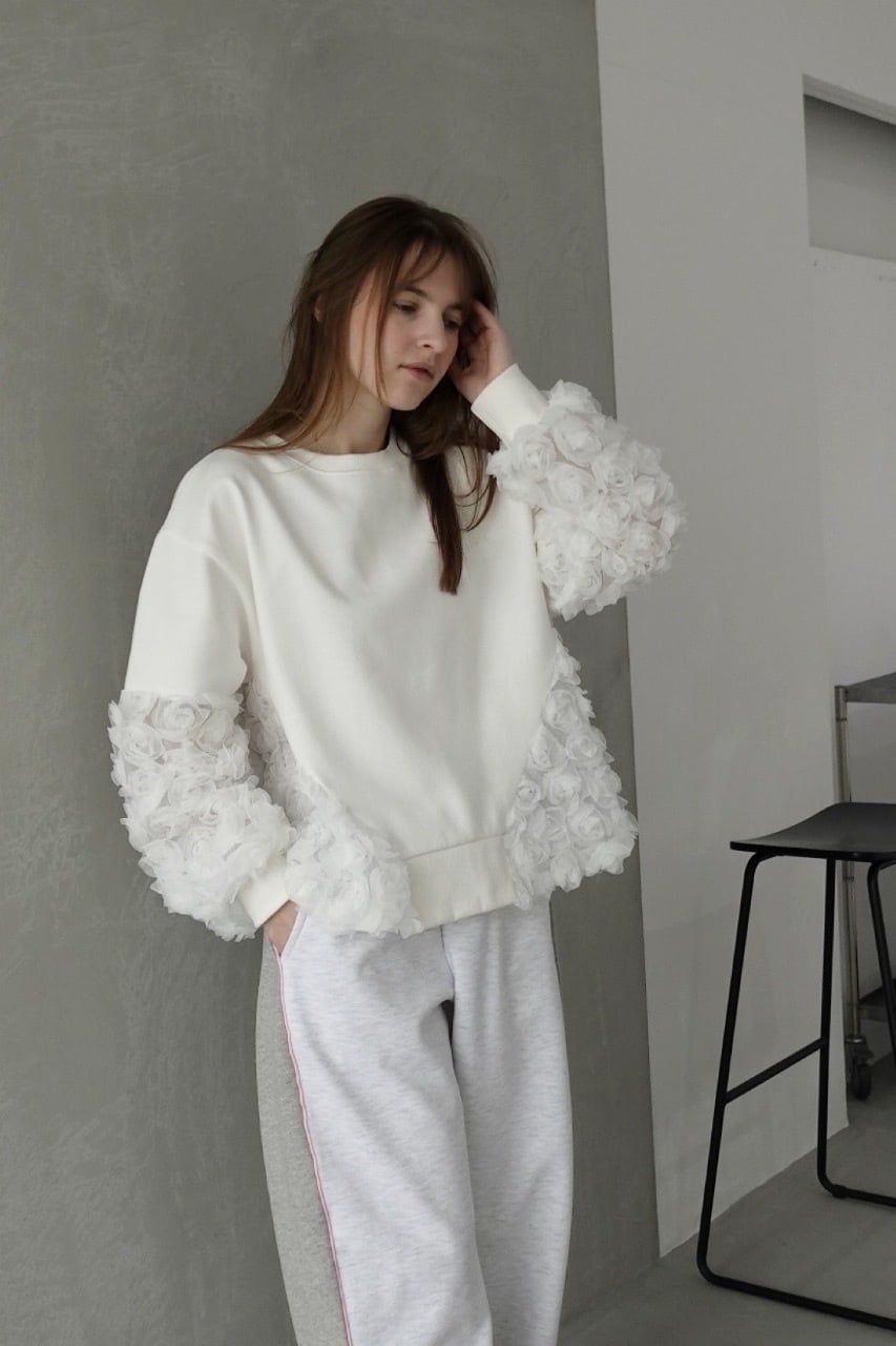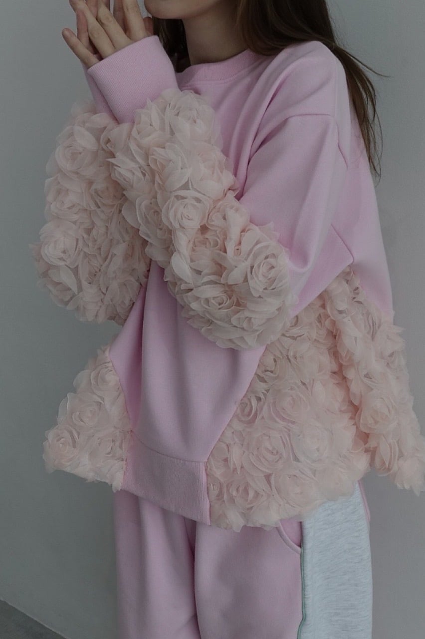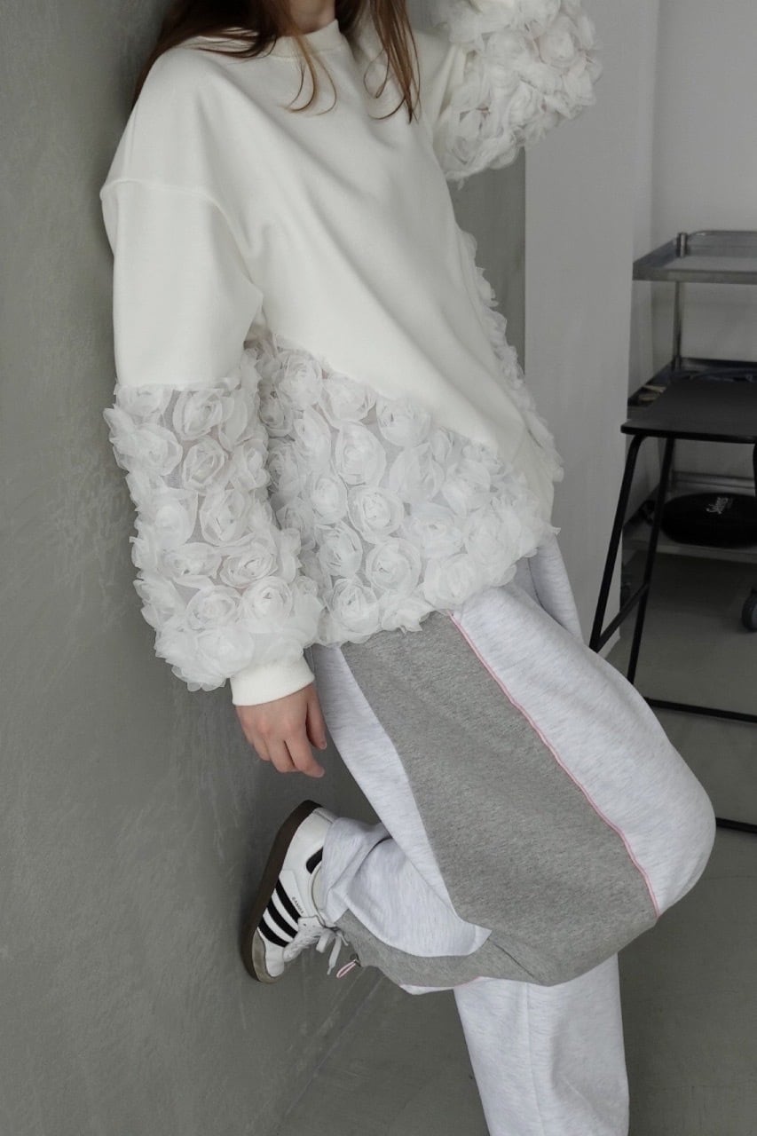 ドレッシーなフラワーチュール生地とカジュアルなスウェット生地をドッキングしたトップス。