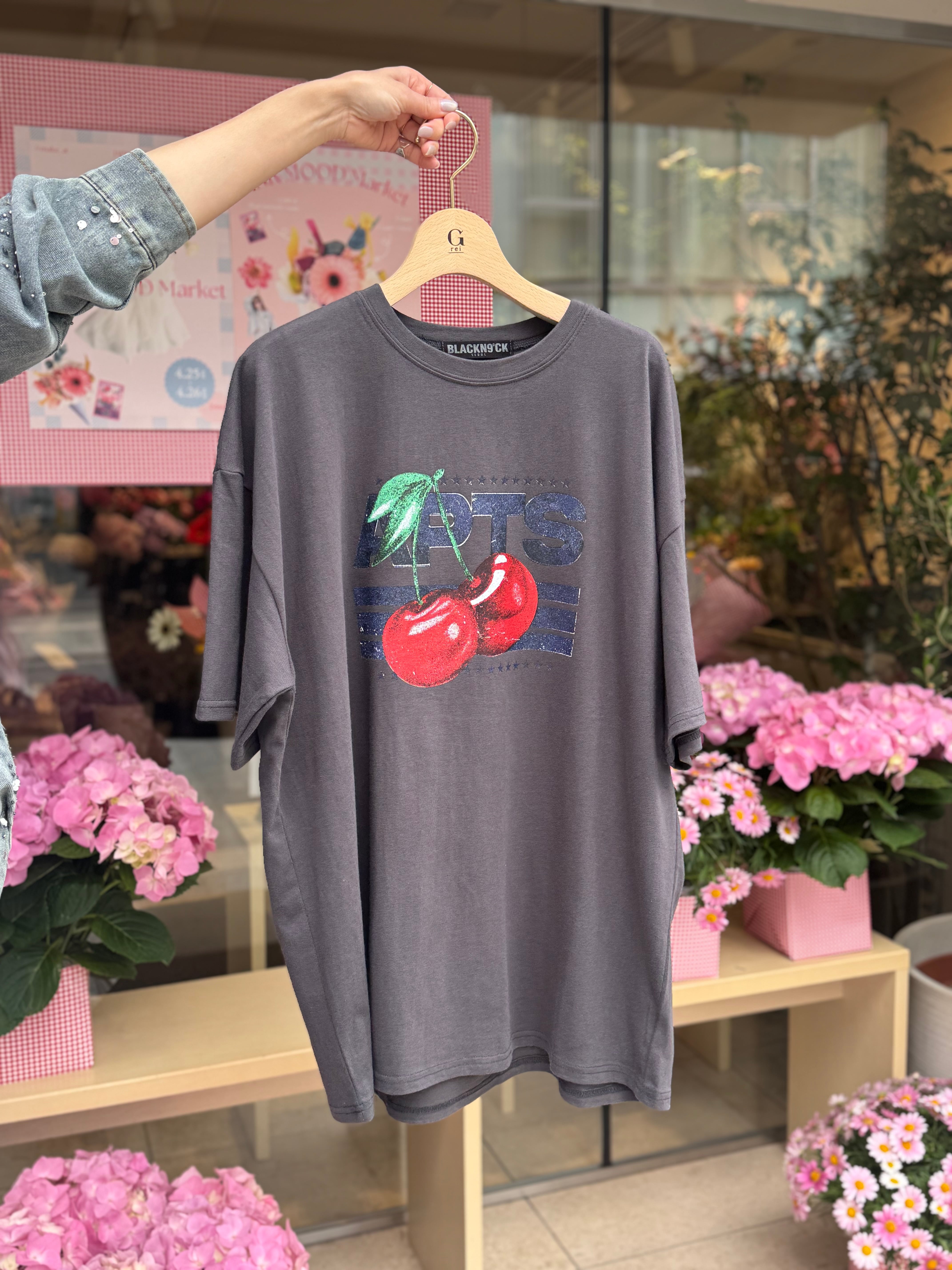 このTシャツは、ユニークなチェリー柄が特徴で、カジュアルなスタイルに遊び心をプラスします。オーバーサイズのシルエットは、リラックスした着心地を提供し、さまざまなコーディネートに合わせやすいのが魅力です。